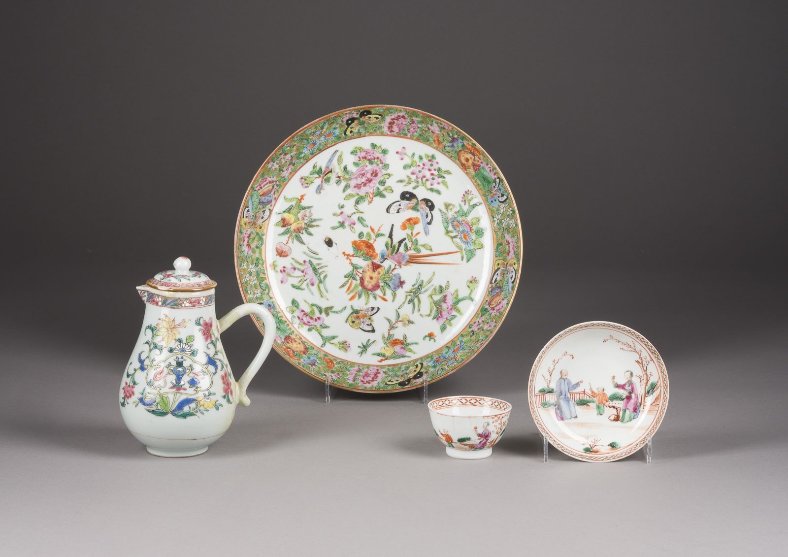 Famille-rose-Teekanne mit Blütendekor sowie ein kantonesischer Famille-rose-Teller mit