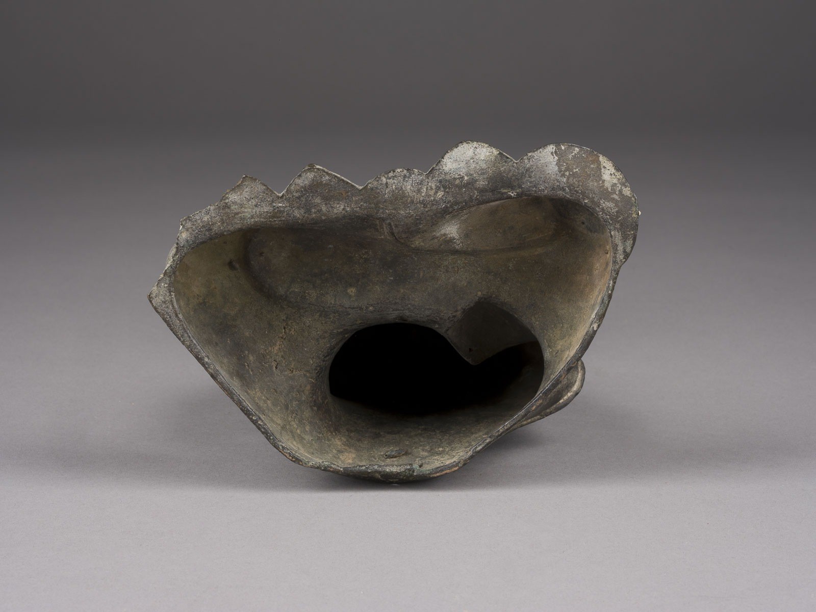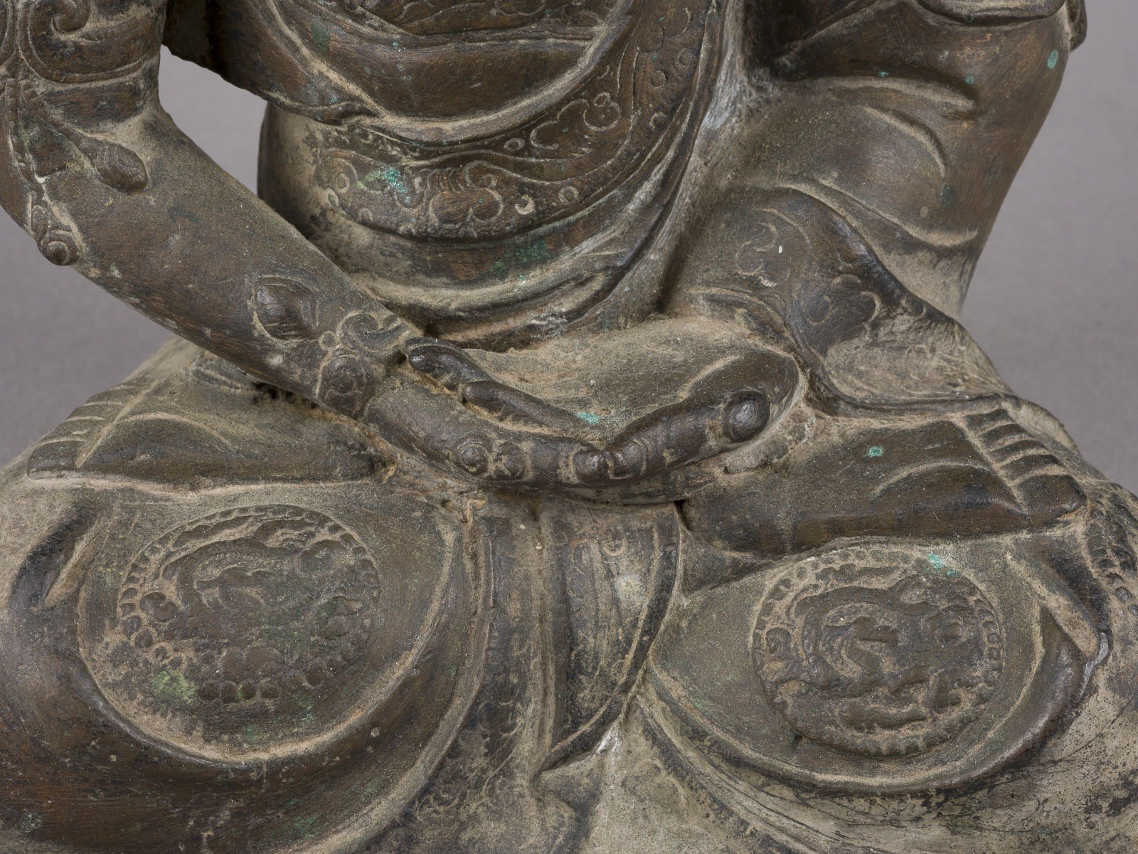 übereinander über den Füßen gelegt. Kopf und Ushnisha sind von spitzen Locken bedeckt. Teilw. ber. u. besch., mit Alters- und Gebrauchsspuren.