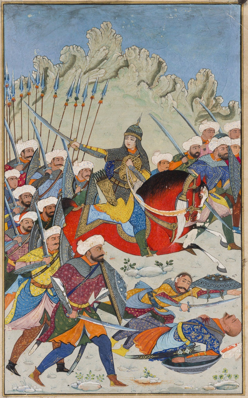 Pigmente und Blattgold auf Papier. Ca. 31,5x19,7 cm. Auf einem galoppierenden Pferd wendet sich Raziah Sultan um, während ihr ermordeter