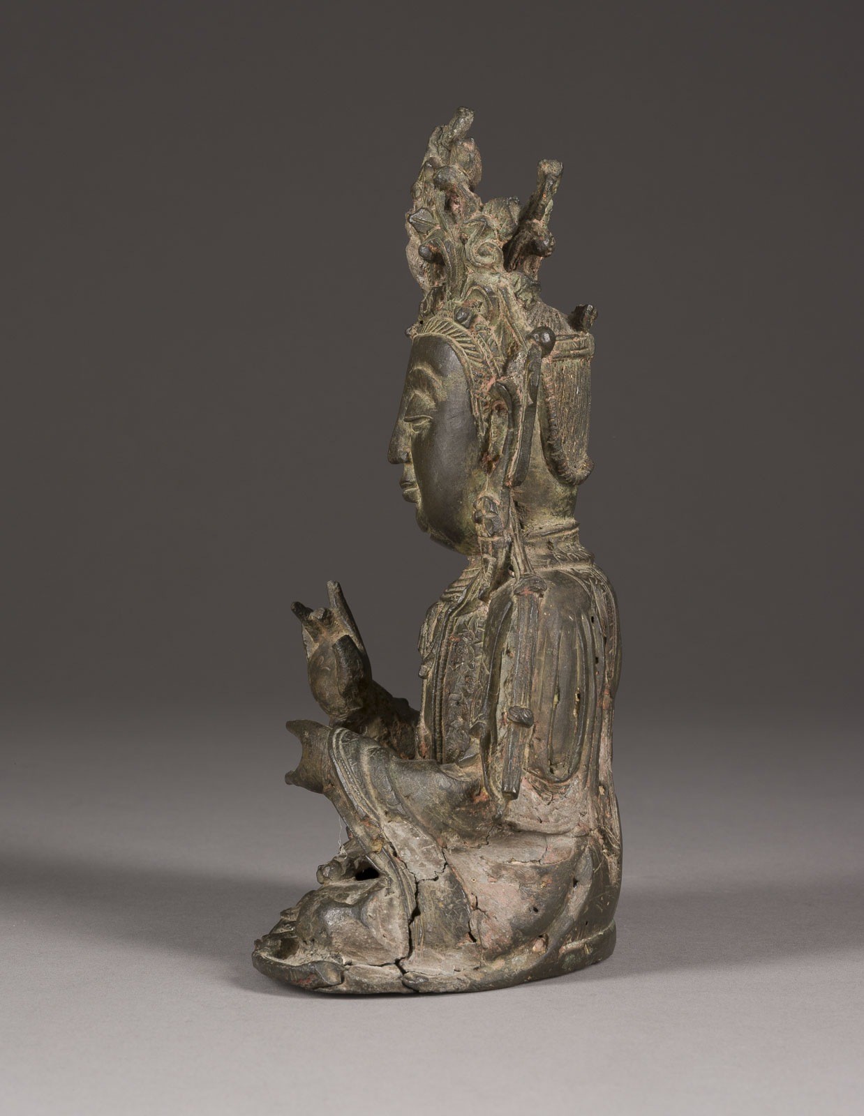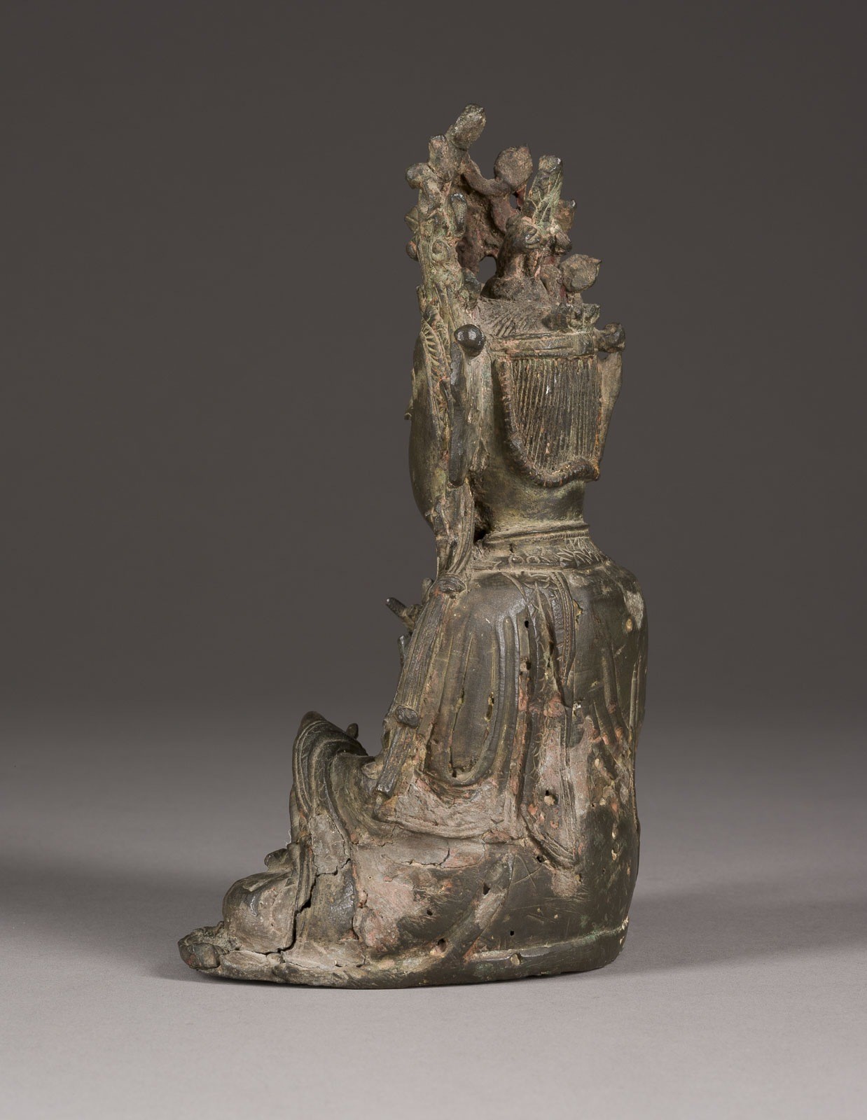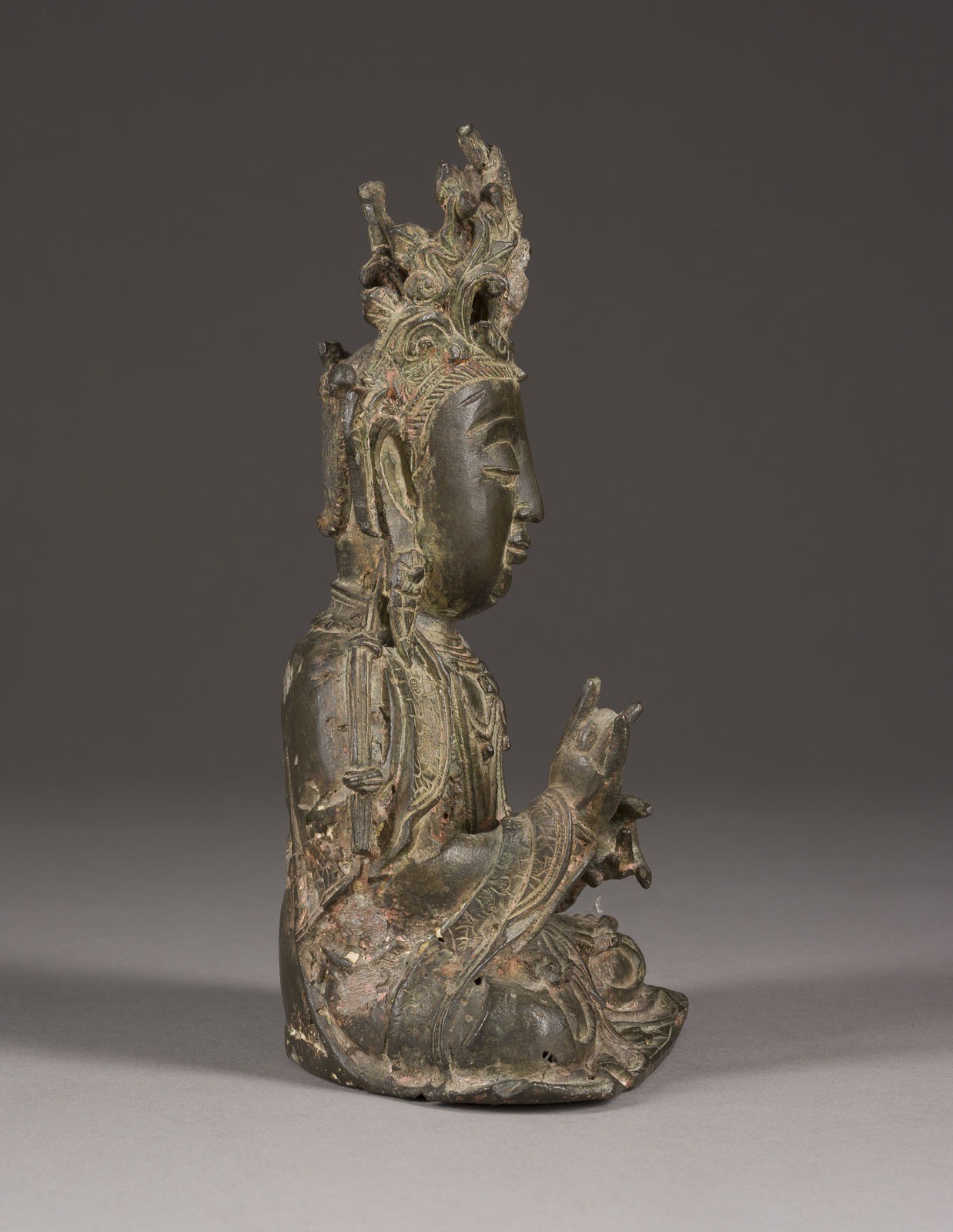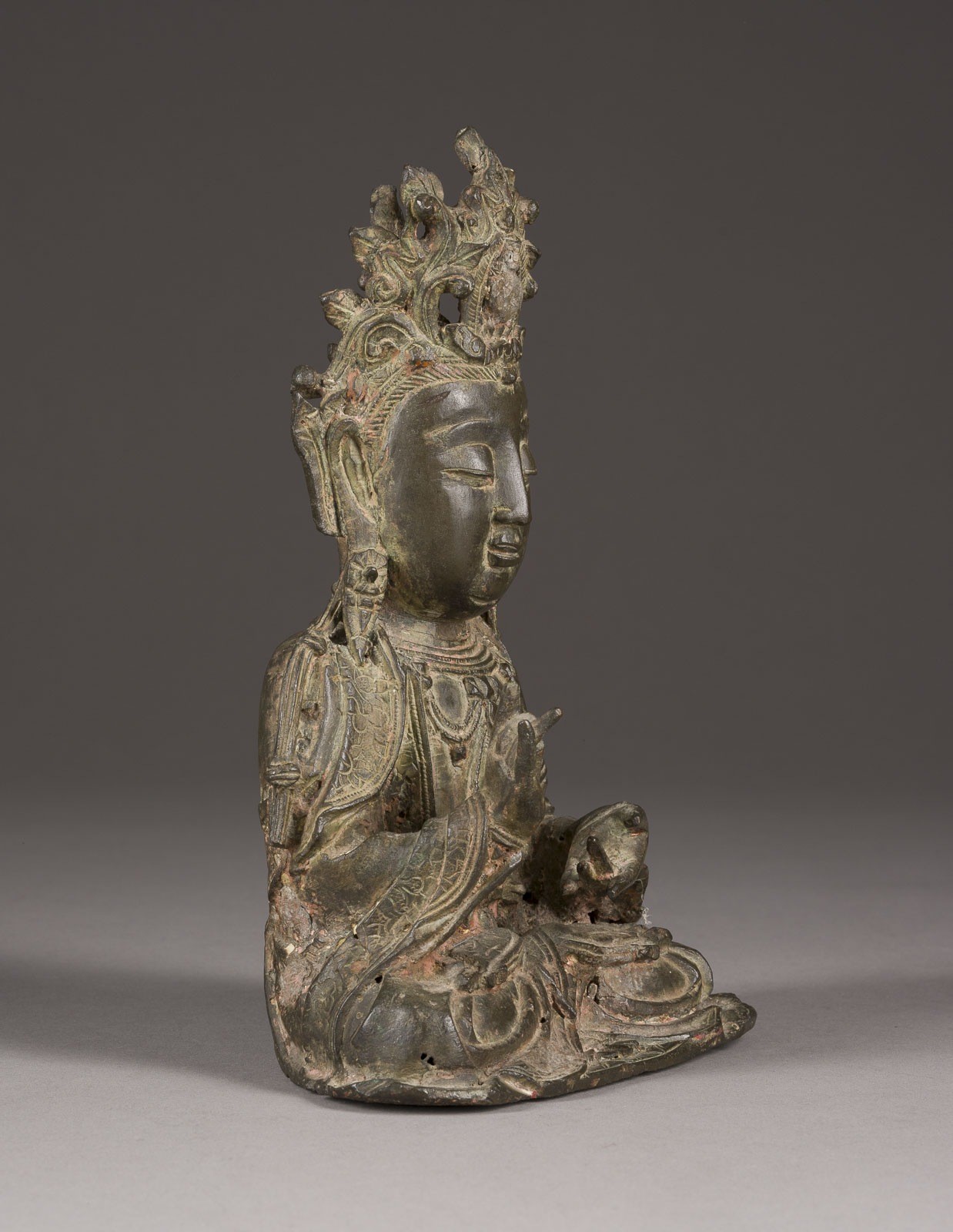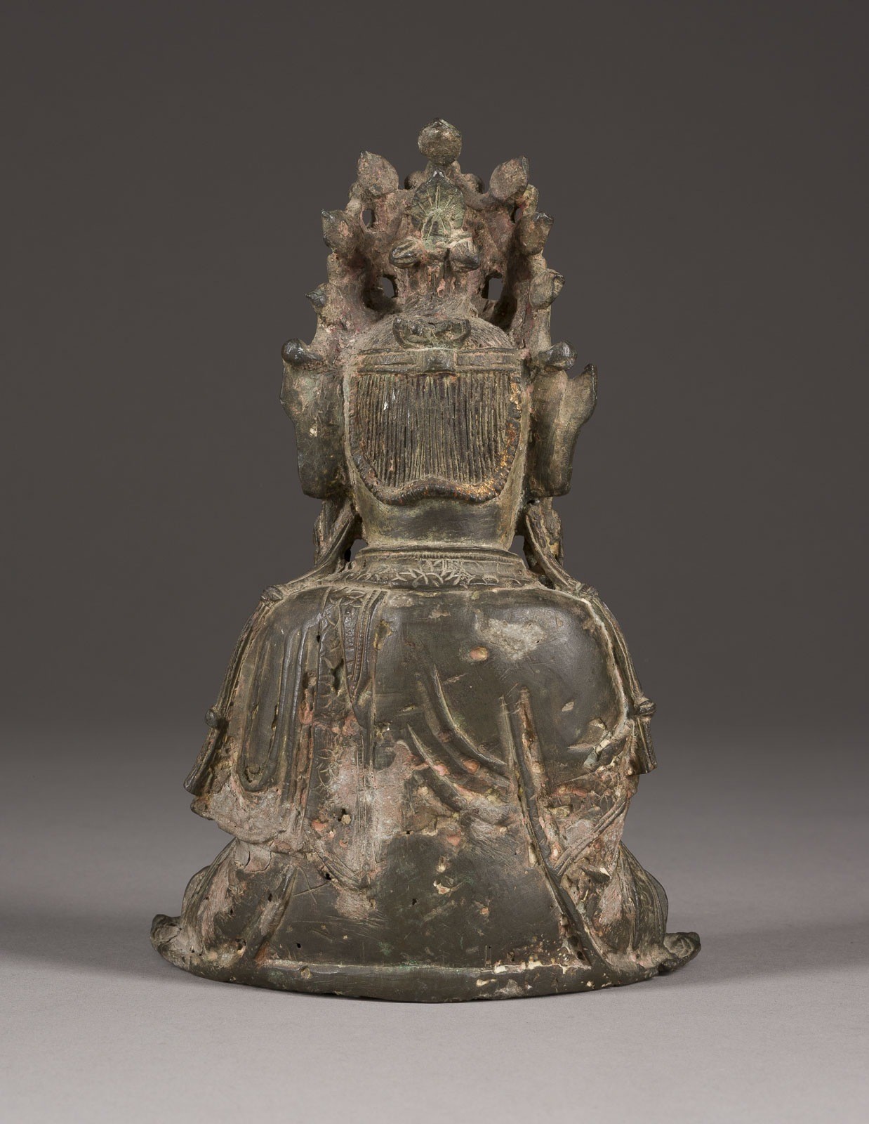 Bronze. H. 20,7 cm. Die gekrönte Guanyin sitzt in Dhyanasana, die rechte Hand in der Varada-Mudra, die linke