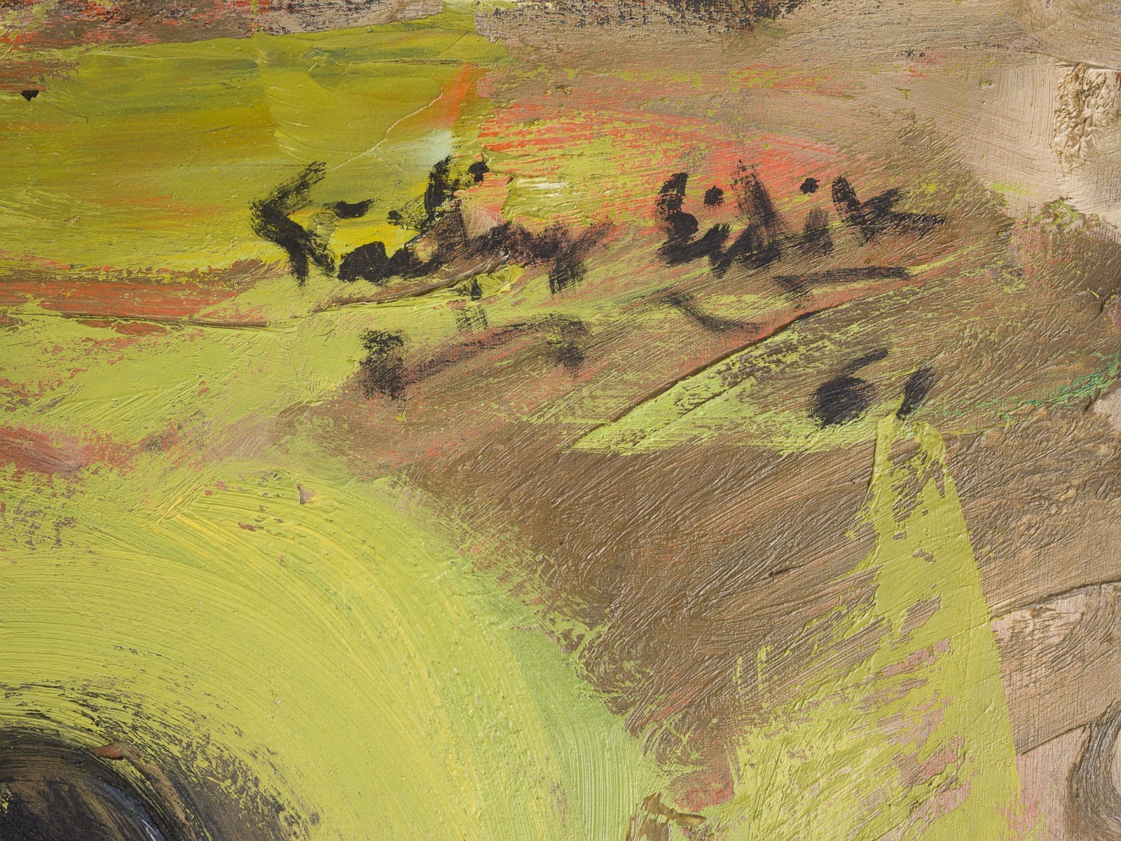 Öl auf Leinwand, gerahmt. Sichtbare Größe 80x72 cm (97x84x6,5 cm mit Rahmen). Signiert und datiert oben rechts. Fadjar Sidik (1930-2004) war ein bahnbrechender indonesischer Maler, der vor allem für