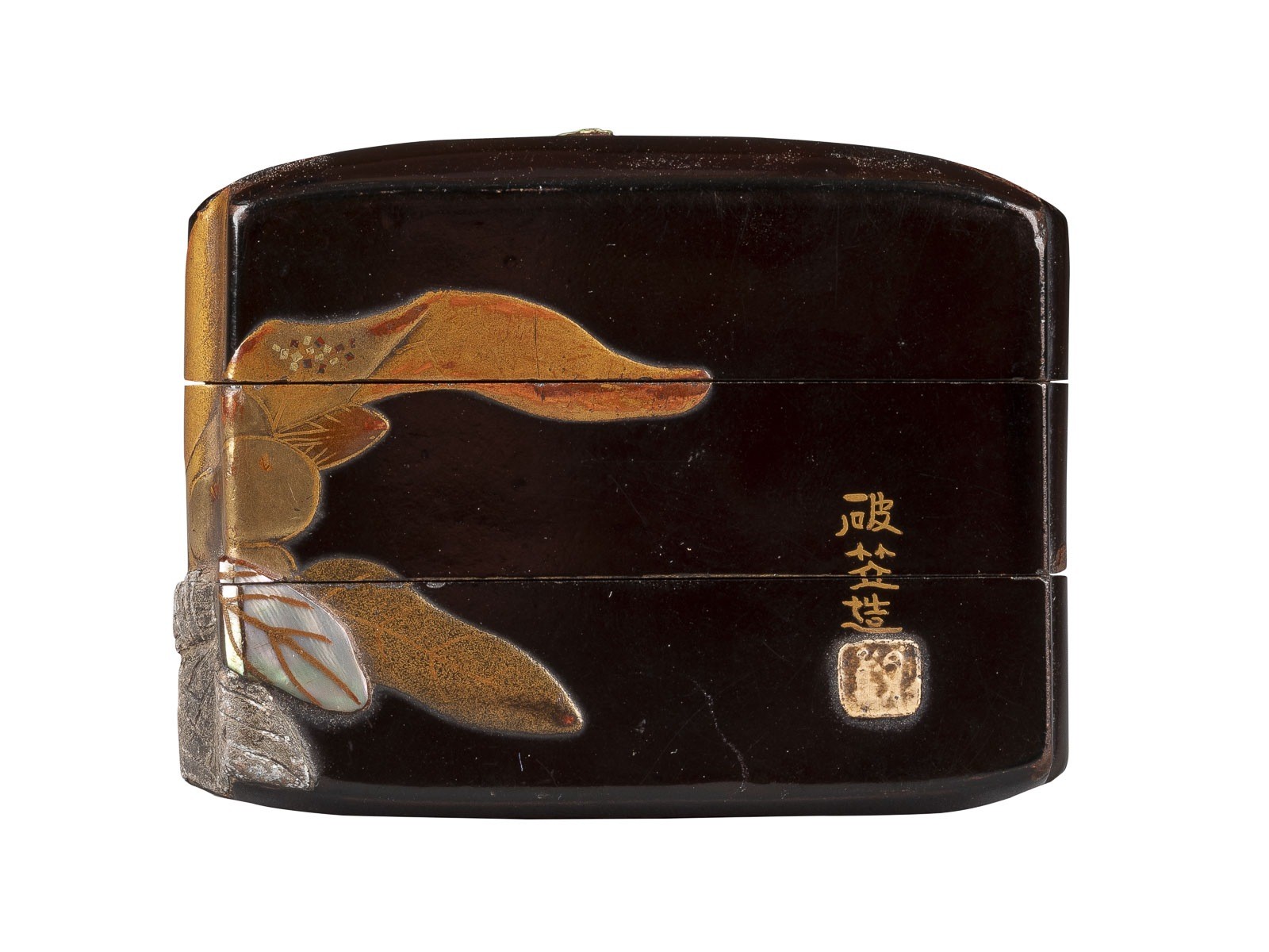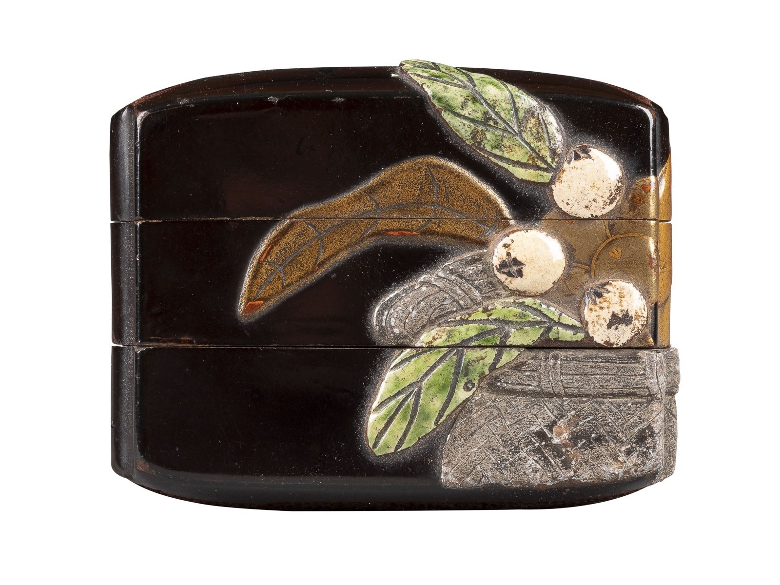 Lackware. H. 5.5 cm. Das Inro ist mit einem durchgehenden Design von einem Bündel Beeren in einem Korb aus