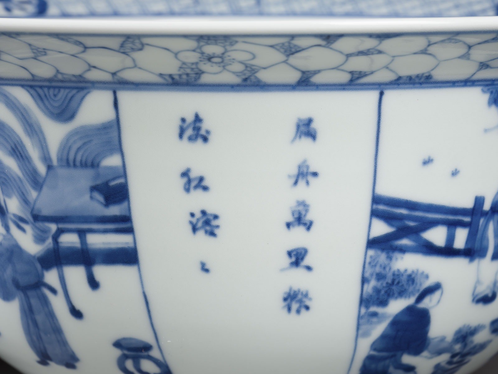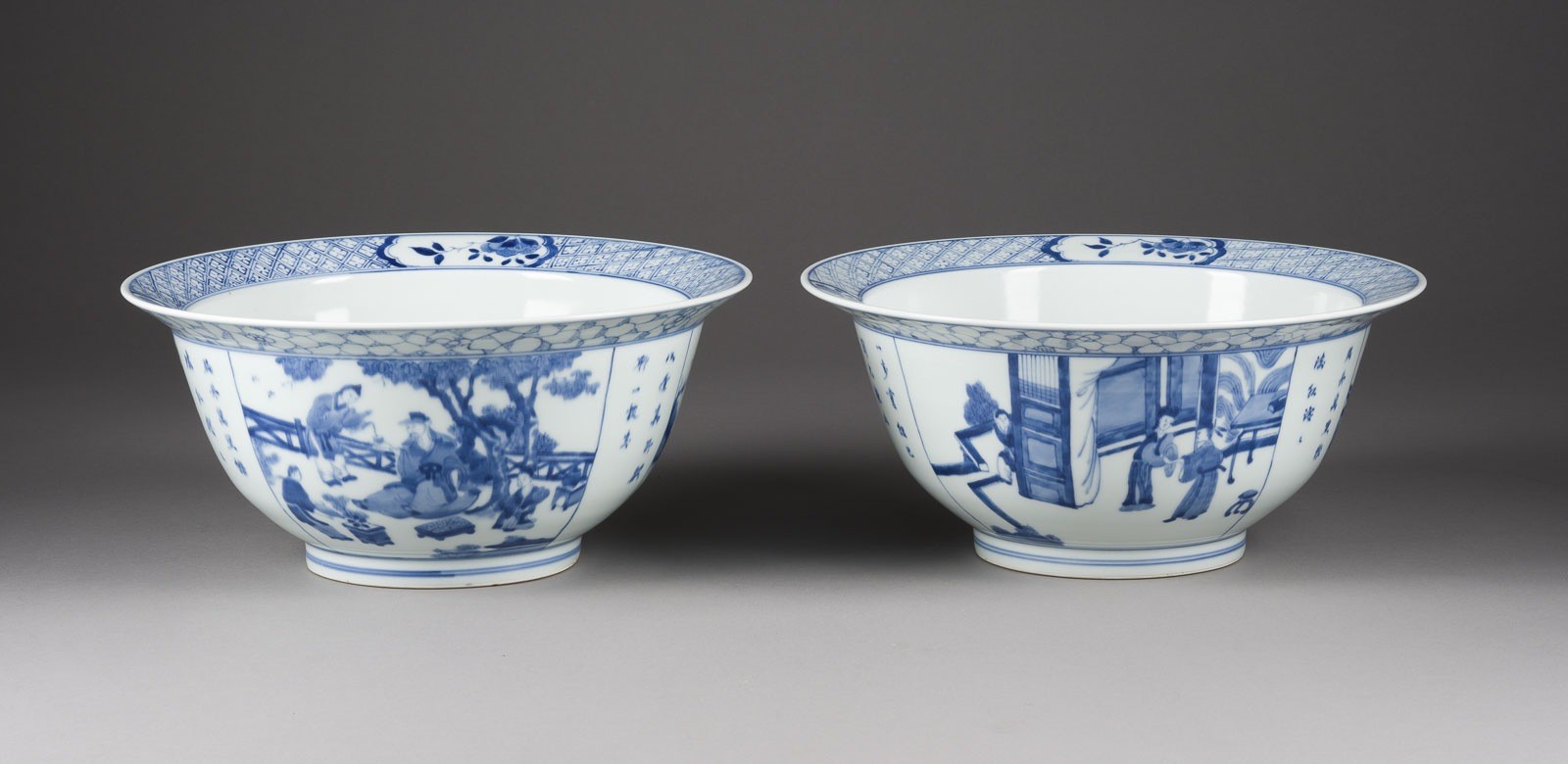 PAAR GROßE BLAU-WEISSE SCHALEN MIT FIGURENDARSTELLUNG