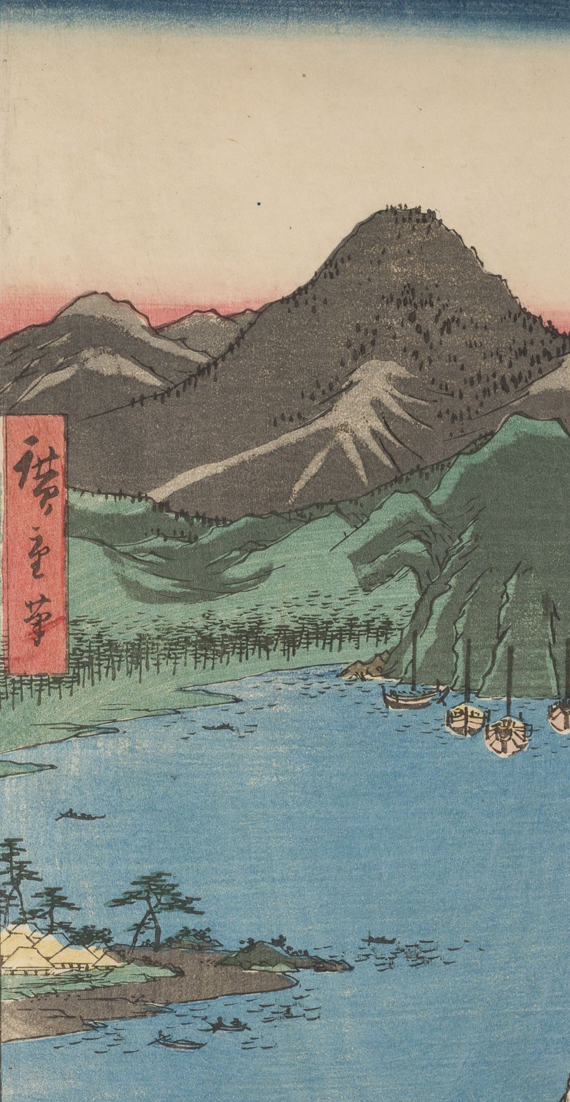 Holzschnitt. 36x23 cm. Signiert "Hiroshige ga". Mit zwei Nanushi-Zensursiegeln "Hama Yahei" und "Magomi Kangeyu". Mit Altersspuren.