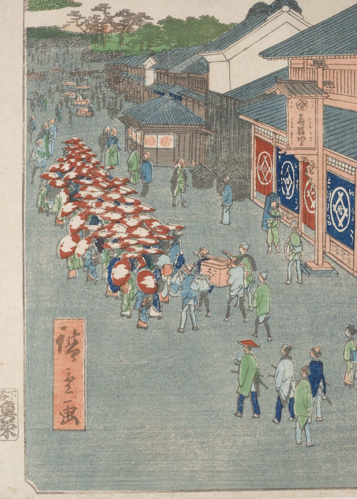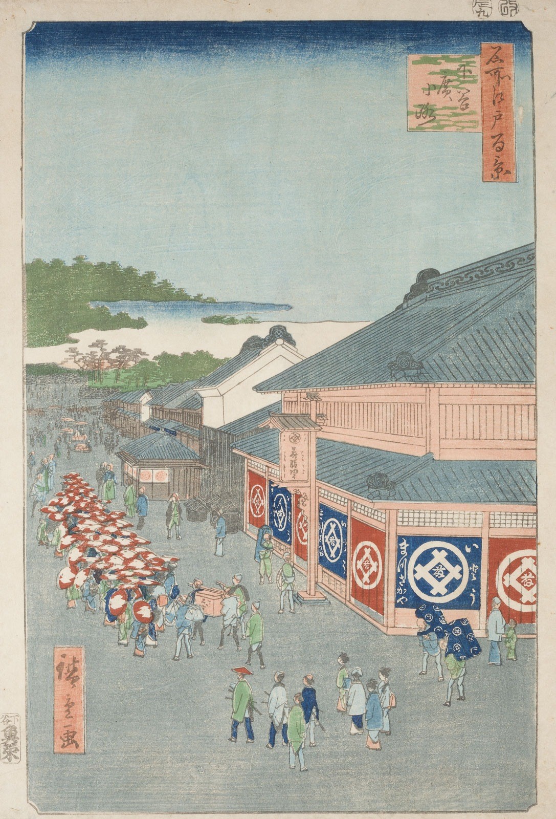 Holzschnitt. 35,5 × 24,5 cm. Aus der Serie "Meisho Edo Hyakkei" (Hundert Ansichten berühmter Orte von Edo), signiert