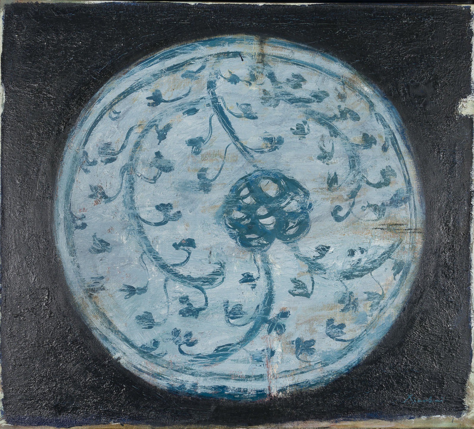 Öl auf Leinwand, gerahmt. 85 x 95 x 2,5 cm. Dieses Werk gehört zu den frühen Arbeiten von Su Xiaobai während seiner Zeit in Deutschland und zeigt chinesische Kultursymbole in Form eines blau-weißen Porzellantellers. In den 1990er Jahren waren seine Sujets häufig Stillleben - Innenräume, Wände, Möbel und Einrichtungsgegenstände -, die ein starkes Heimatgefühl und chinesisches Erbe widerspiegelten.