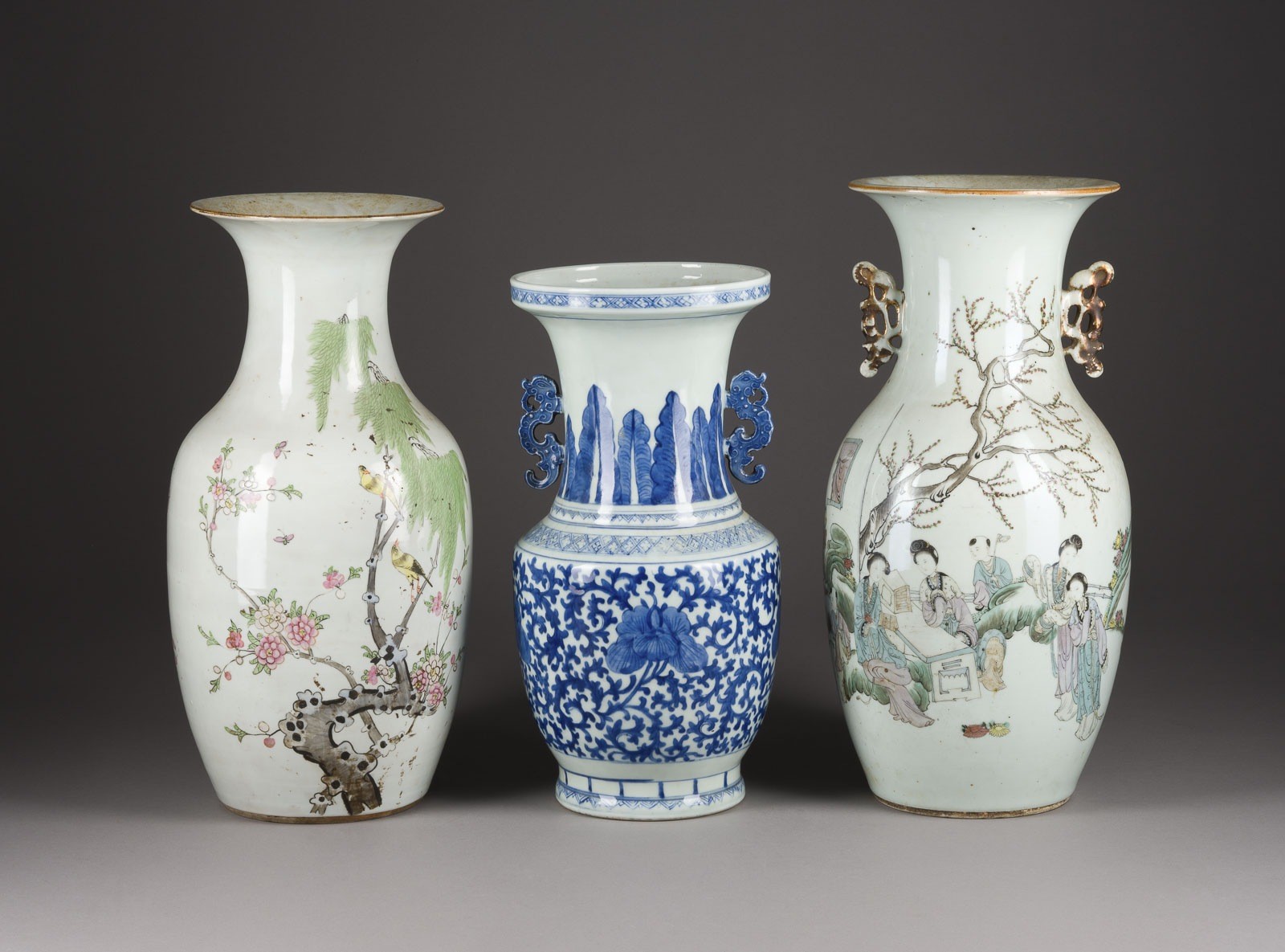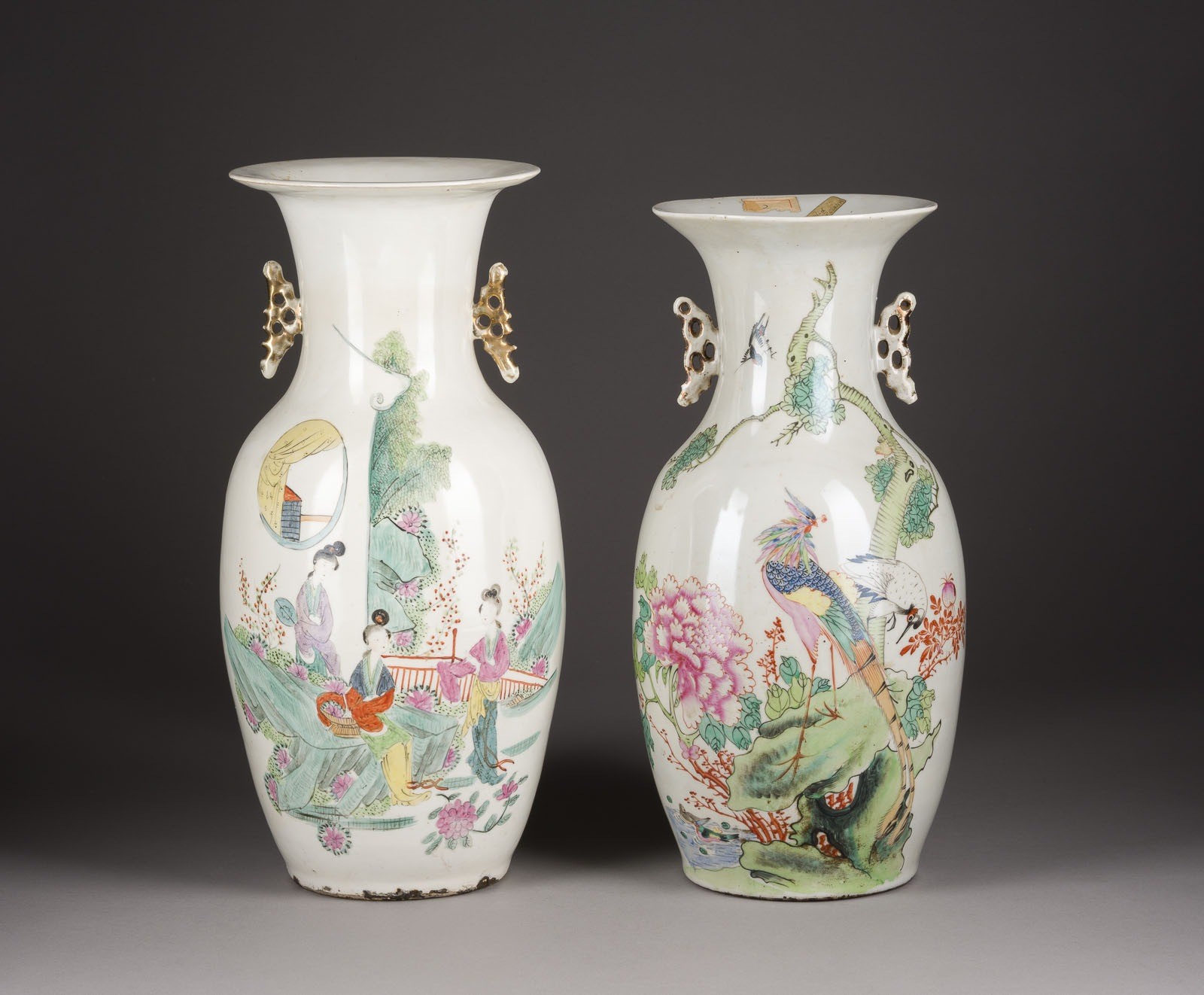 Porzellan. H. 37-45 cm. Darunter vier Qianjiangcai-Vasen, zwei mit Figurszenen, zwei mit Blumendekor, sowie eine