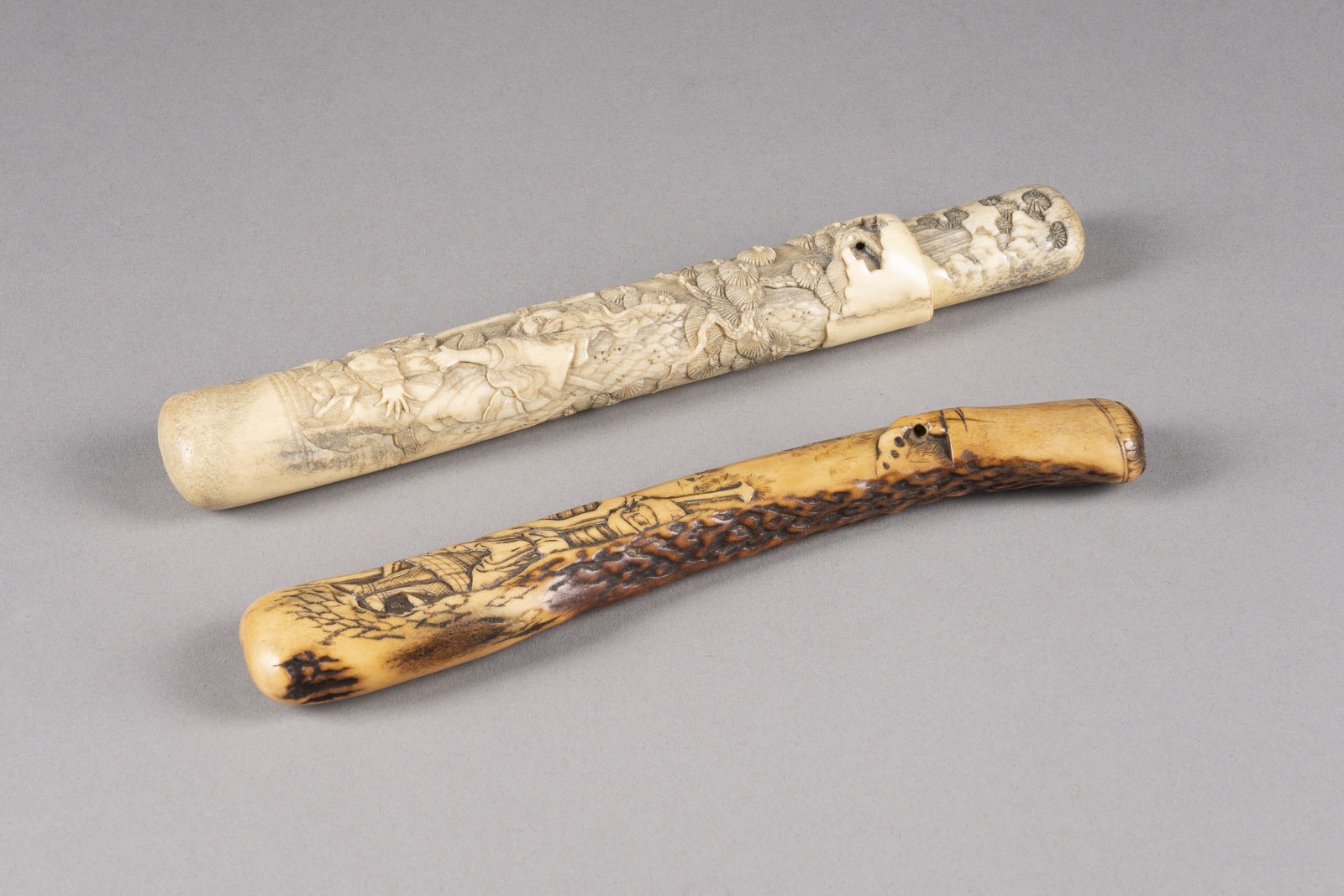 Hirschhorn. H. 19,4-21,2 cm. Darunter ein Kiseruzutsu vom Typ Otoshi-zutsu und ein Kiseruzutsu vom Typ Muso-zutsu. Mit Alters- und Gebrauchsspuren sowie Rissen.