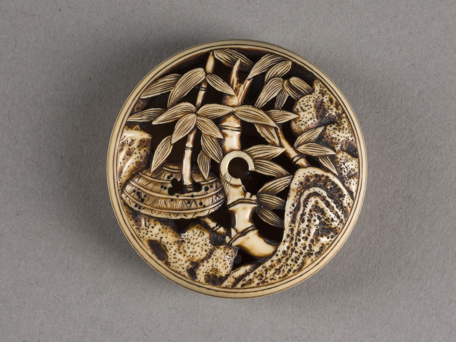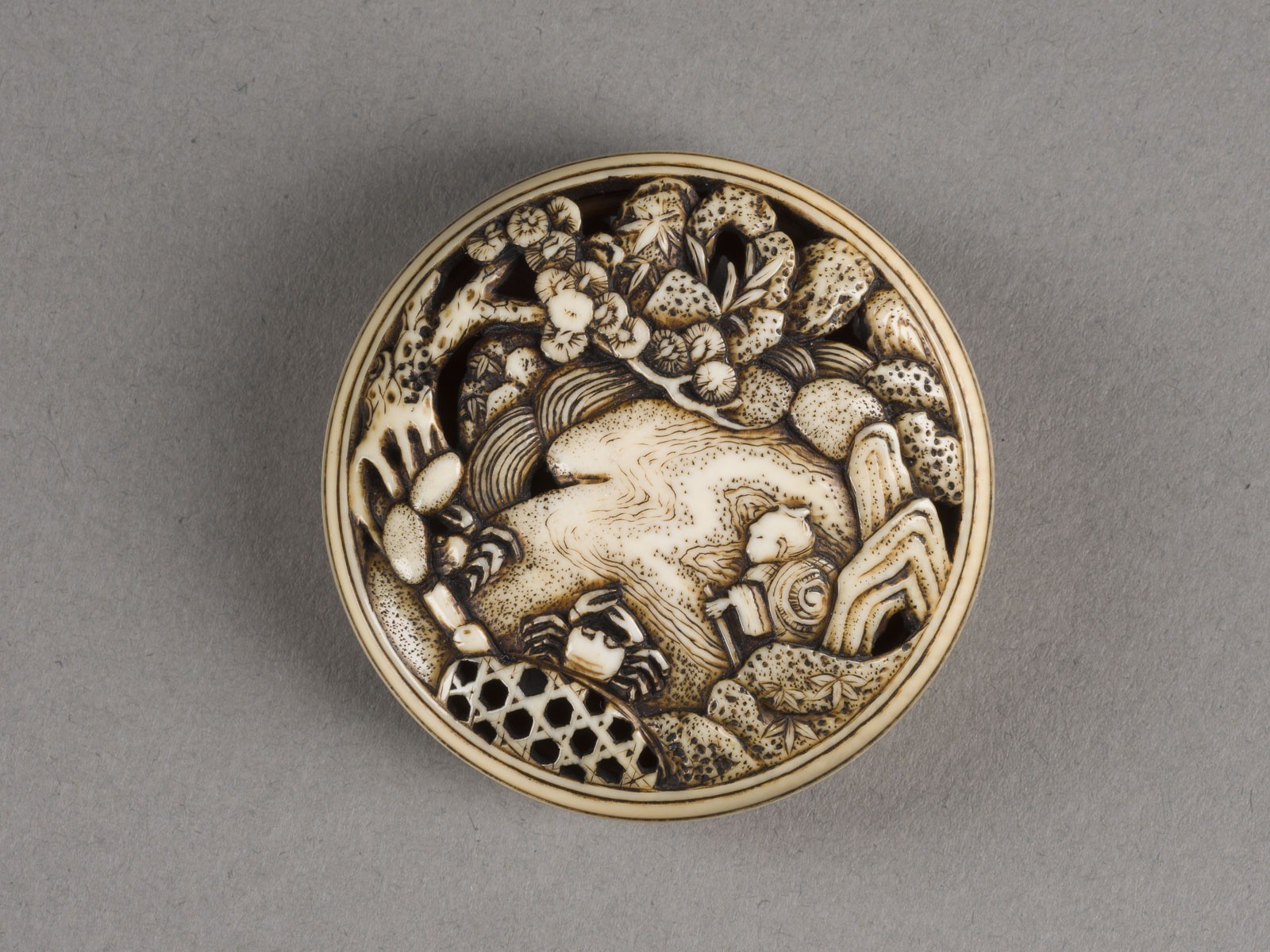 Elfenbein. Ca. 2,5 × 2,5 × 2,4 cm und D. 5,1 cm. Ein quadratisches Netsuke mit der Darstellung einer Pavillonszene sowie ein rundes Netsuke