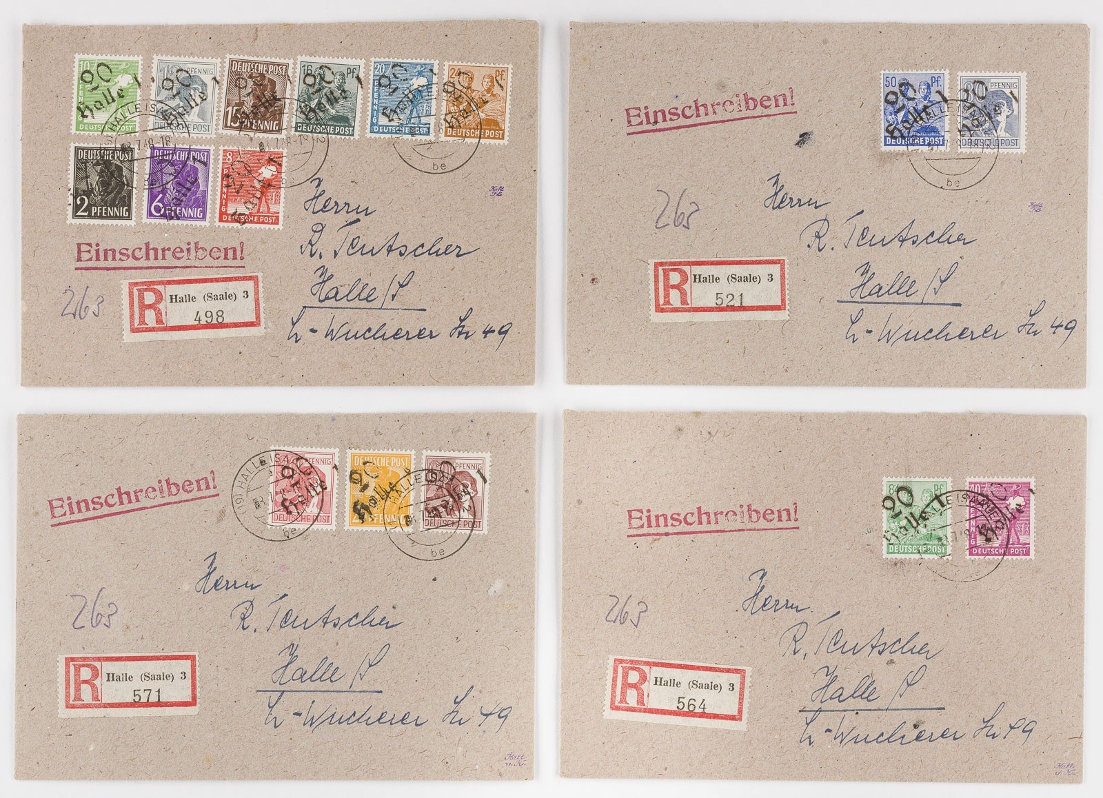 Sachsen/Halle/Plauen/Spremberg/Walddorf (Meinigen) Konvolut vier innerstädtische Einschreibebriefe Halle sowie 48 diverse Marken, häufig mit