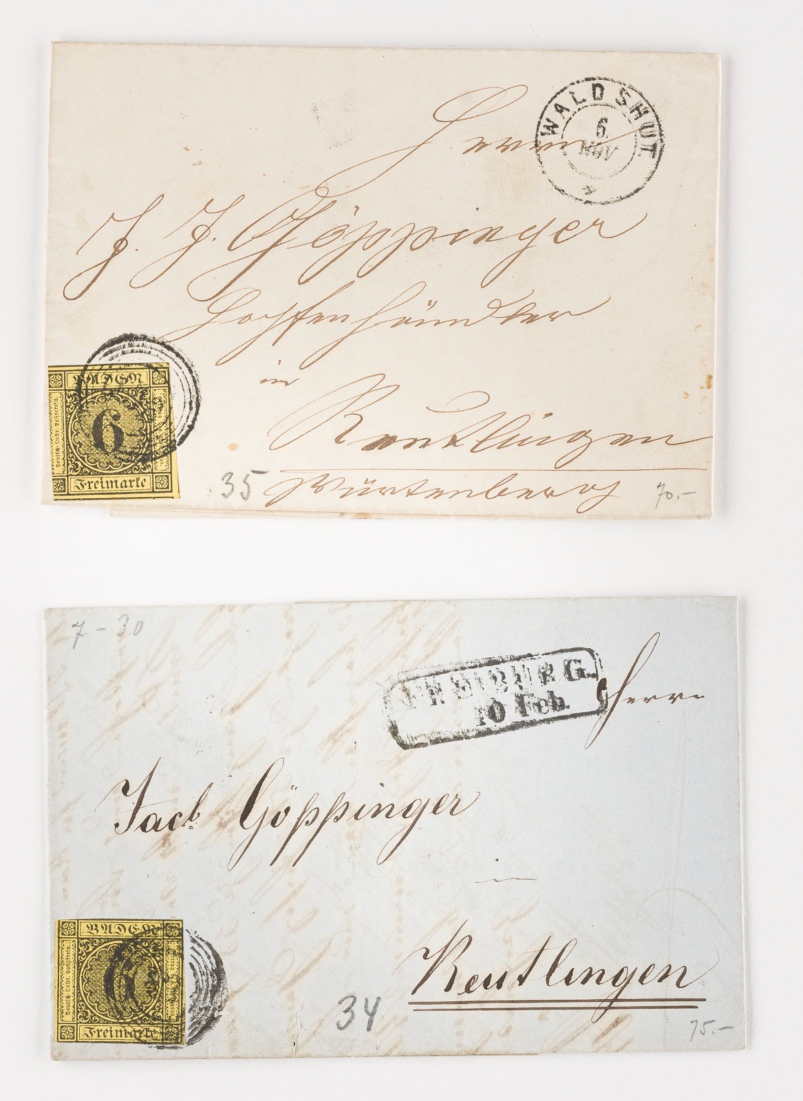 Baden Konvolut vier Inlandsbriefe: 6 Kreuzer nebst Stempel 'WALDSHUT 6 NOV'; 6 Kreuzer nebst Stempel 'FREIBURG 10. Feb.'; 6 Kreuzer und 3 Kreuzer nebst Stempel 'MANNHEIM 21 Feb'; Drei 3 Kreuzer nebst Stempel MANNHEIM 9. Mrz.).