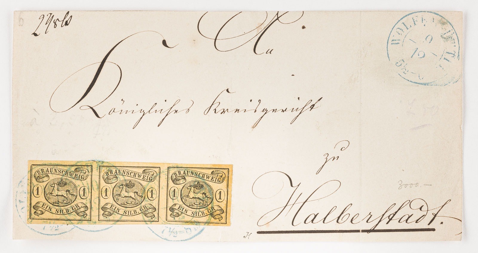 Braunschweig Dreierstreifen 1 Silbergroschen auf Inlandsbrief (beschnitten) nach Halberstadt