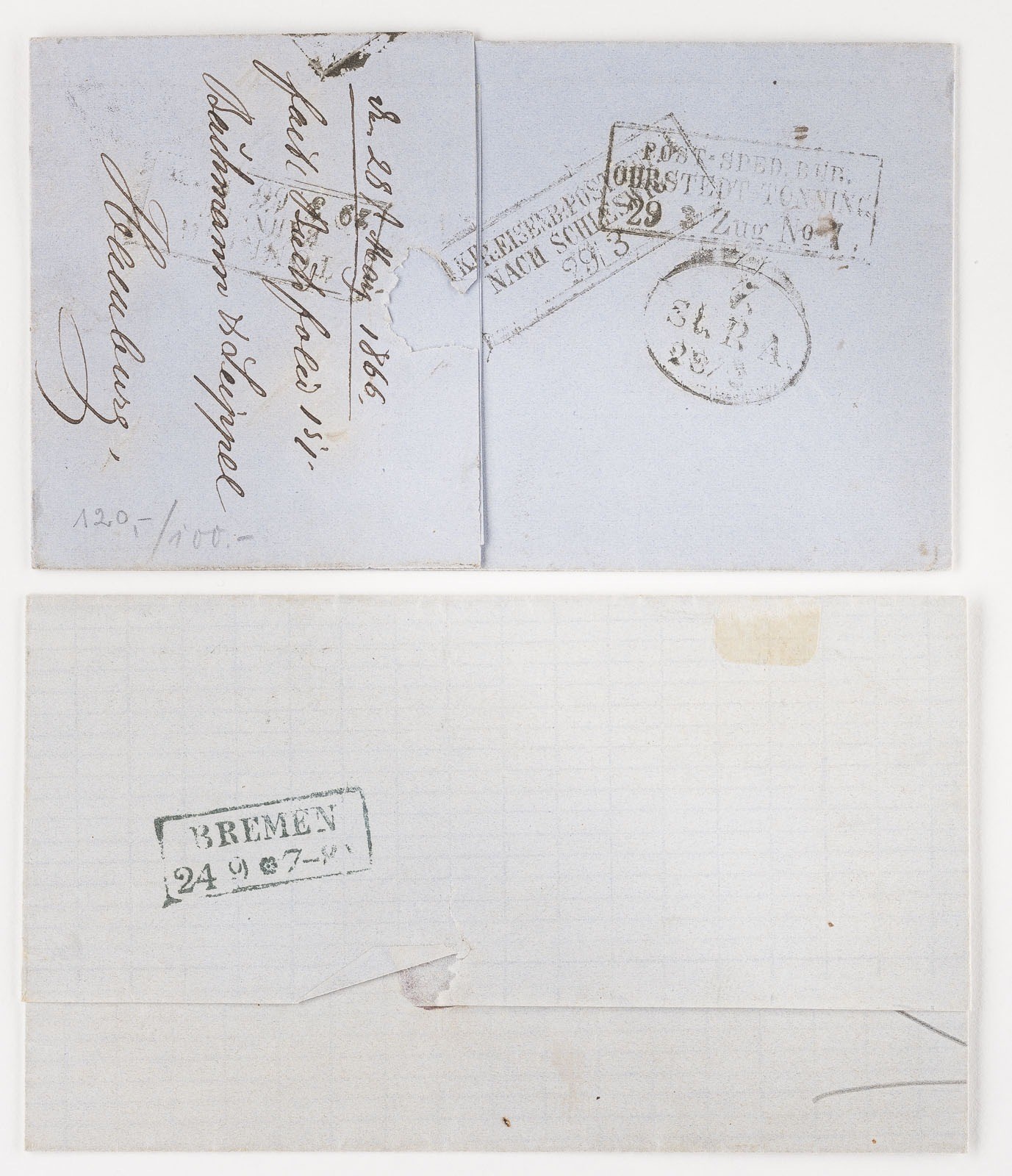 Hamburg Konvolut zwei Inlandsbriefe. Drei Schilling nach Bremen nebst Stempel 'HAMBURG 23/9 65'