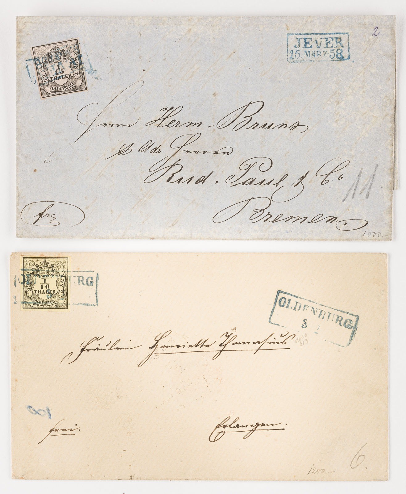 Oldenburg Zwei Inlandsbriefe: 1/10 Thaler nebst zweizeiligem Rechteckstempel (zweimal) 'OLDENBURG 3