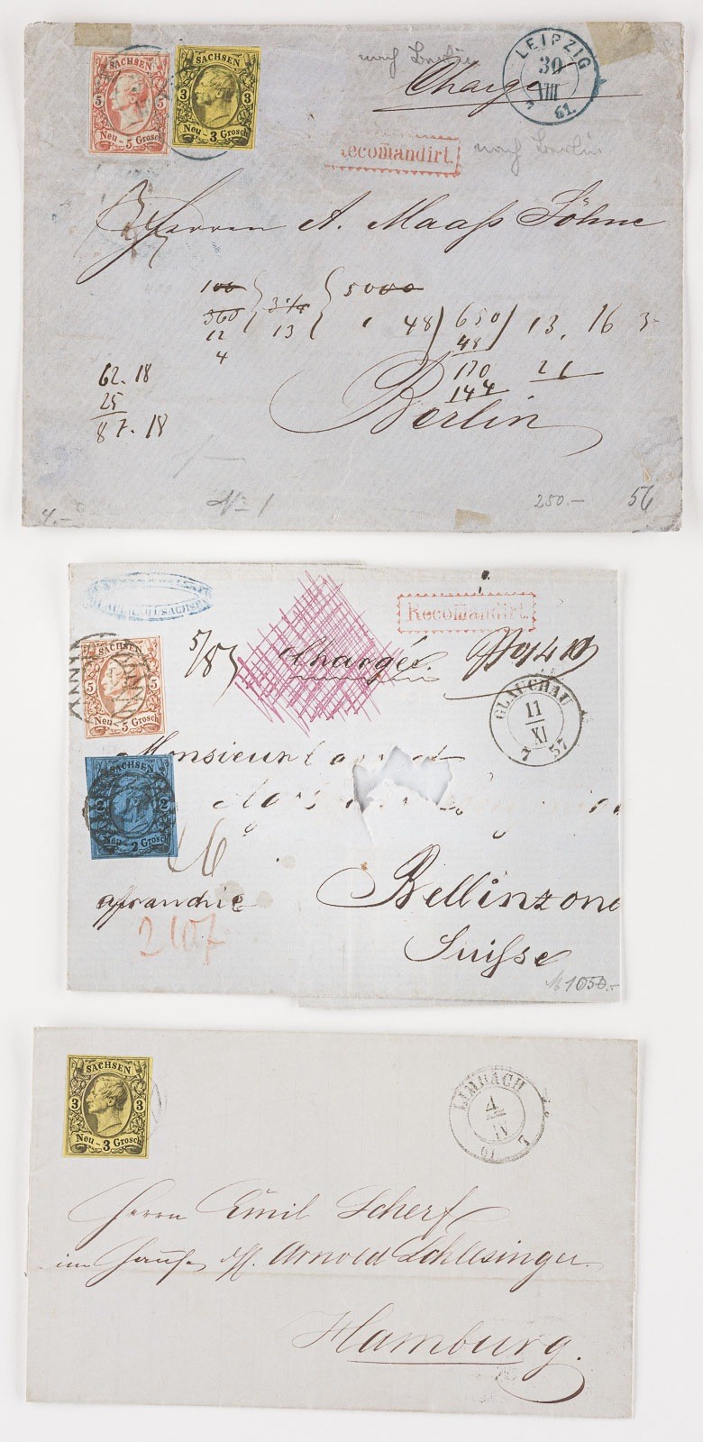 Sachsen Konvolut zwei Inlandsbriefe und einen Auslandsbrief: Fünf und drei Neu-Groschen nebst