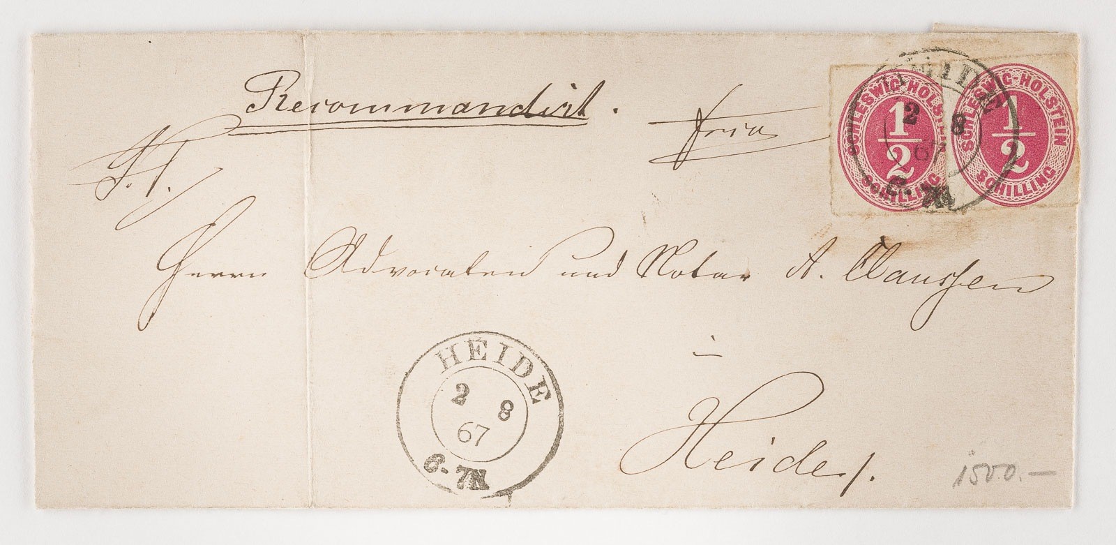 Schleswig-Holstein Zwei 1/2 Schilling auf Inlandsbrief nach Heide. Bezeichnet: 'Recommandirt. Nebst