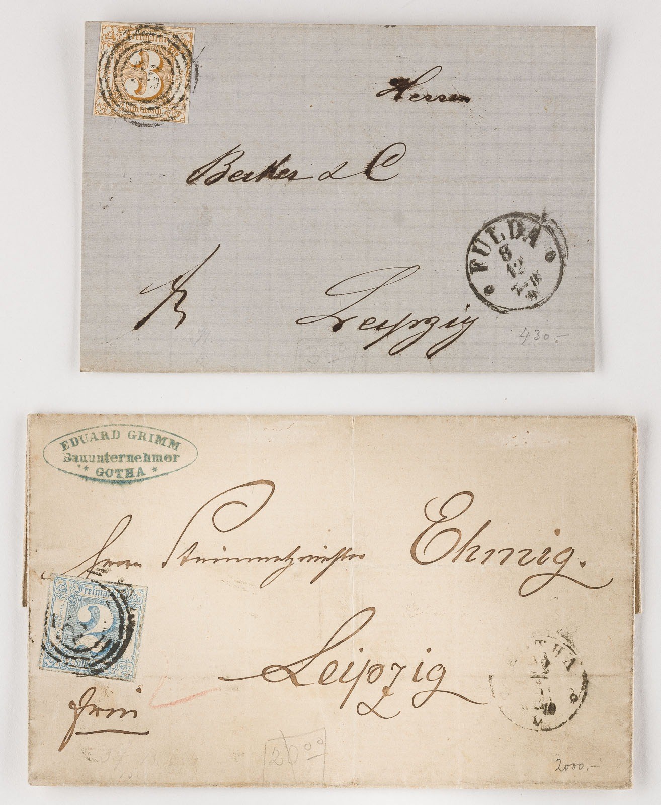 Thurn und Taxis Konvolut vier Inlandsbriefe nach Leipzig: Drei Silbergroschen nebst Rundstempel 'FULDA 8 12..' verso Zweikreisstempel 'AUSGABE 4 9 XII; Zwei Silbergroschen nebst Rundstempel 'GO..A (??), verso Zweikreisstempel 'AUSGABE XII 1/2 23 V' Zwei Silbergroschen nebst Zweikreisstempel verso Stempel (ungedeutet); Ein Silbergroschen nebst Zweikreisstempel 'WEIDA 2 10 1863' verso Stempel 'GERA 3 10 1863 (auf dem Kopf)' und Zweikreisstempel 'AUSGABE VII 3 ..'.