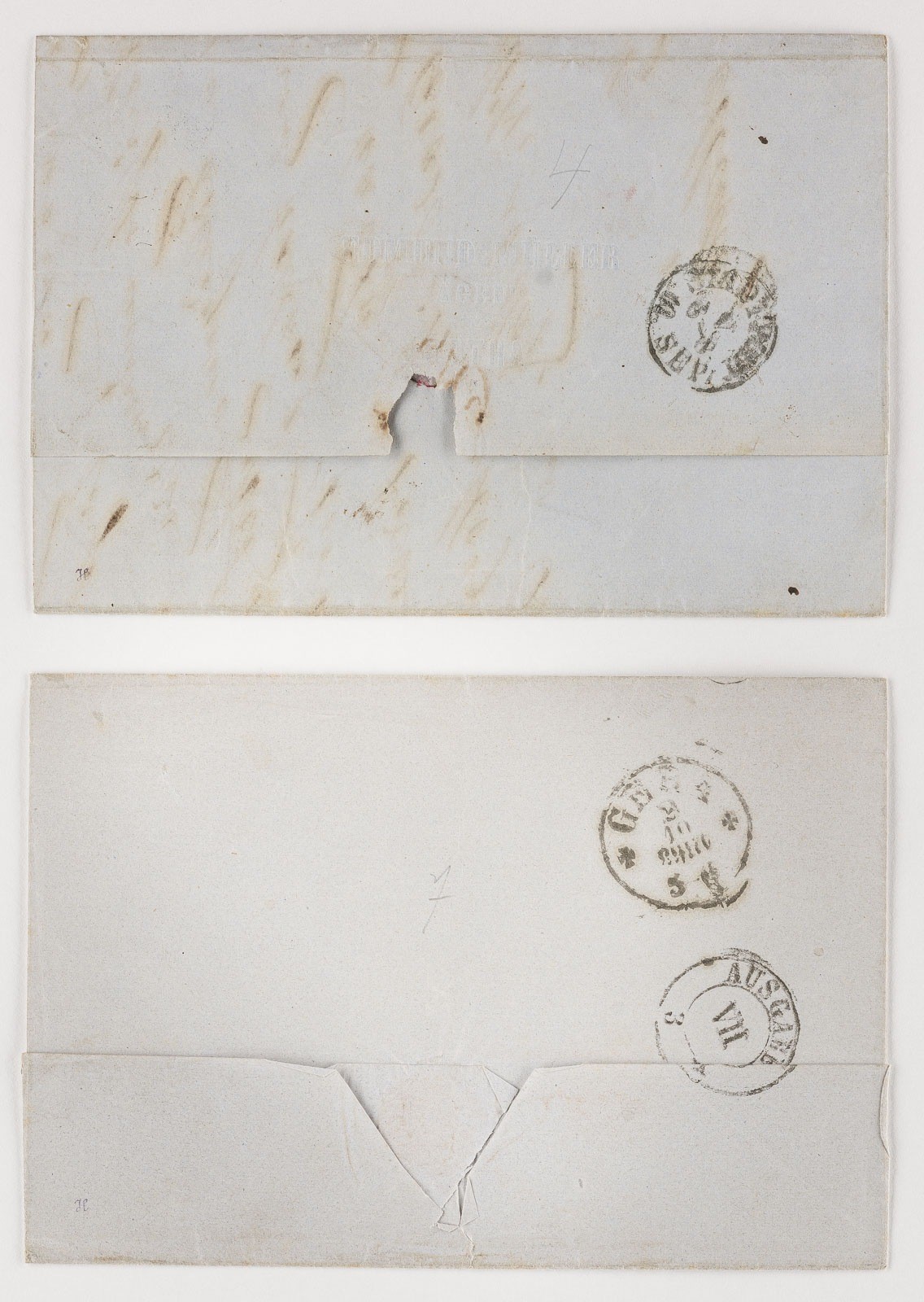 Thurn und Taxis Konvolut vier Inlandsbriefe nach Leipzig: Drei Silbergroschen nebst Rundstempel 'FULDA 8 12..' verso Zweikreisstempel 'AUSGABE 4 9 XII; Zwei Silbergroschen nebst Rundstempel 'GO..A (??), verso Zweikreisstempel 'AUSGABE XII 1/2 23 V' Zwei Silbergroschen nebst Zweikreisstempel verso Stempel (ungedeutet); Ein Silbergroschen nebst Zweikreisstempel 'WEIDA 2 10 1863' verso Stempel 'GERA 3 10 1863 (auf dem Kopf)' und Zweikreisstempel 'AUSGABE VII 3 ..'.