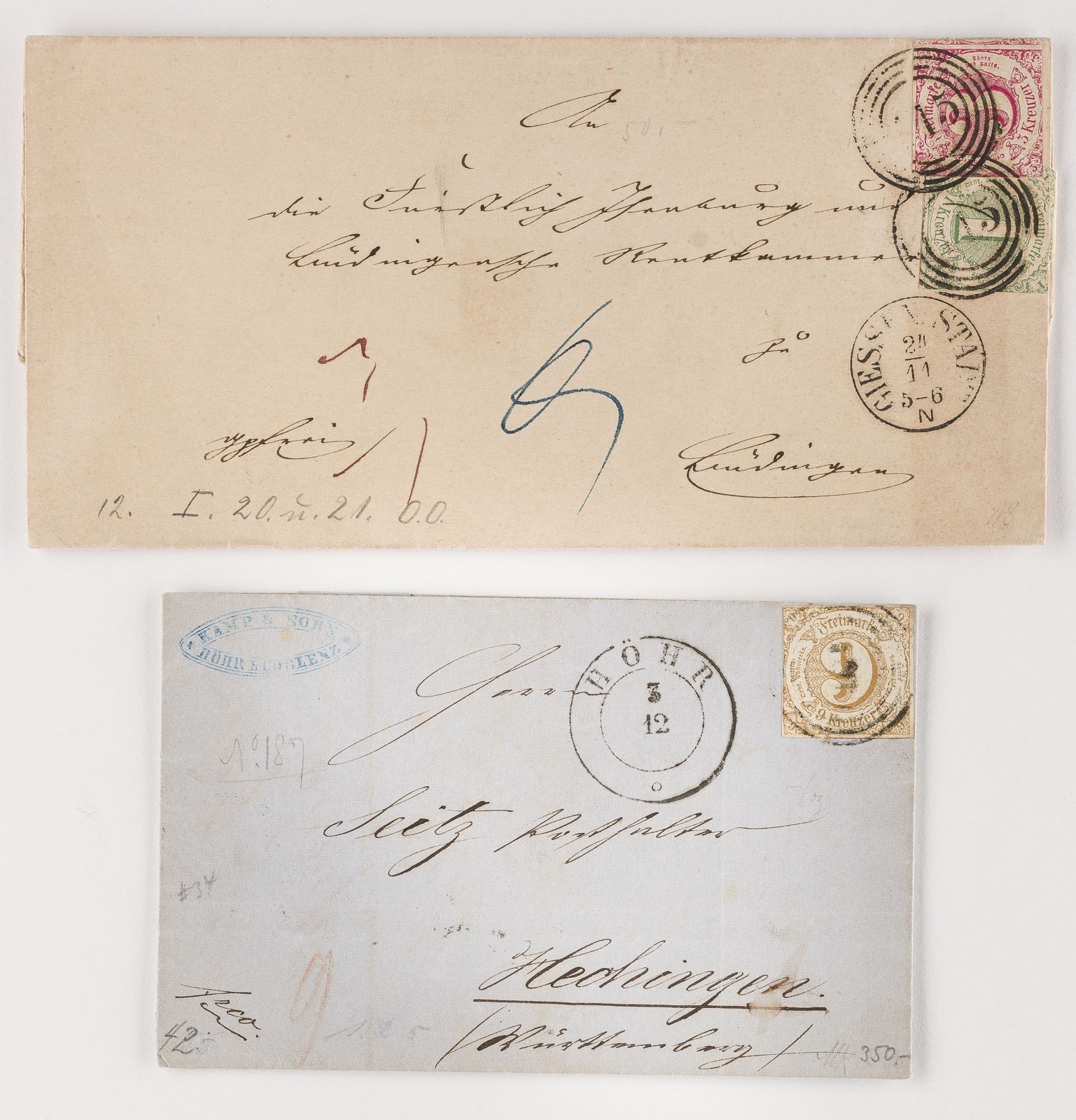 Apr 1864'; Neun Kreuzer nach Hechingen nebst Zweikreisstempel 'HÖHR 3 12' verso