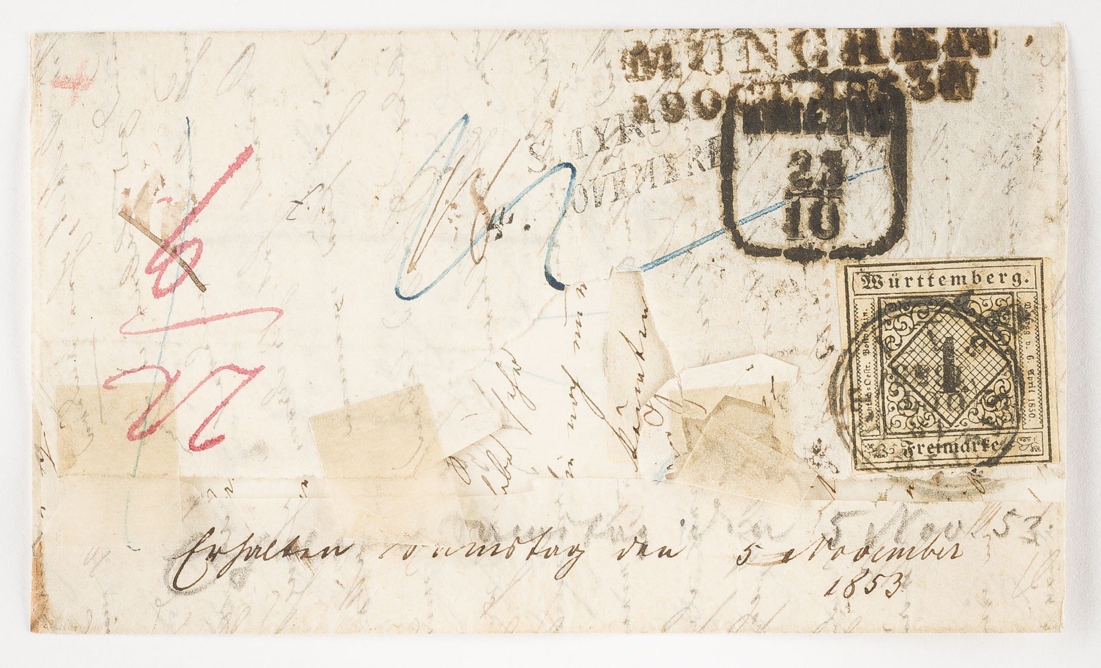 (verso), drei, neun und achtzehn Kreuzer nebst vier Rundstempel 'STUTTGART 18 OCT 1853'