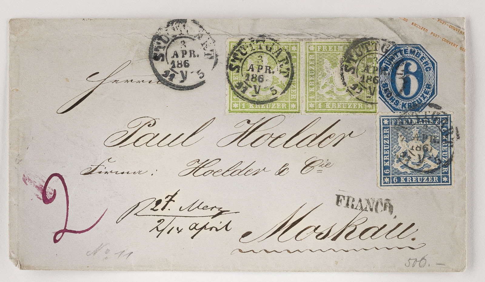 Württemberg Auslandsbrief nach Moskau: Zweimal ein Kreuzer und sechs Kreuzer sowie sechs Kreuzer