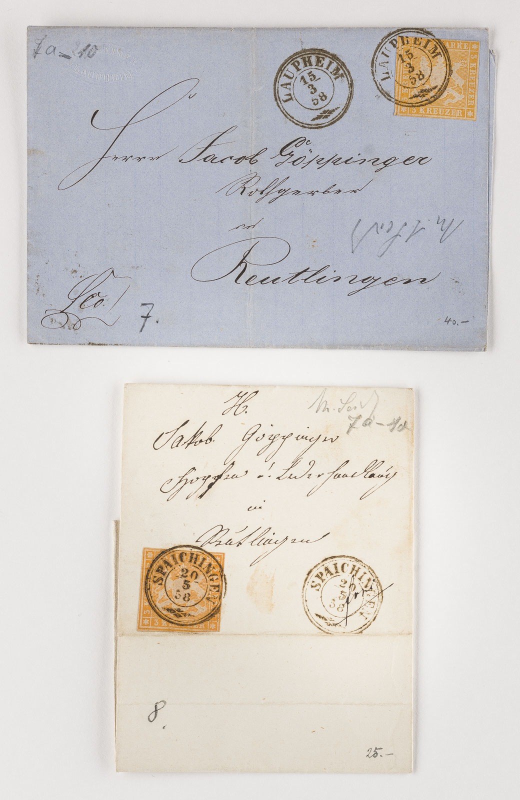 58'; Drei Kreuzer nach Reutlingen nebst zweimal Stempel 'SPAICHINGEN 20 5 58'; Drei