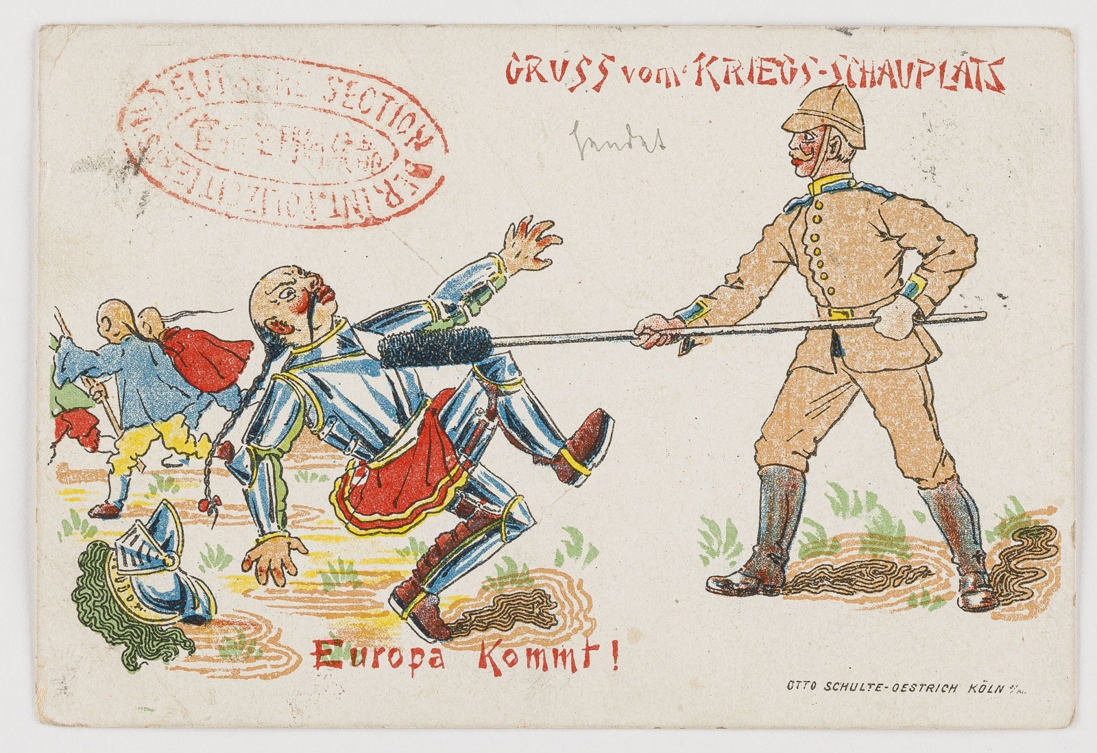 China Postkarte 'GRUSS VOM KRIEGS-SCHAUPLATZ EUROPA KOMMT', 1901. 3 Pfennig (Germania) sowie