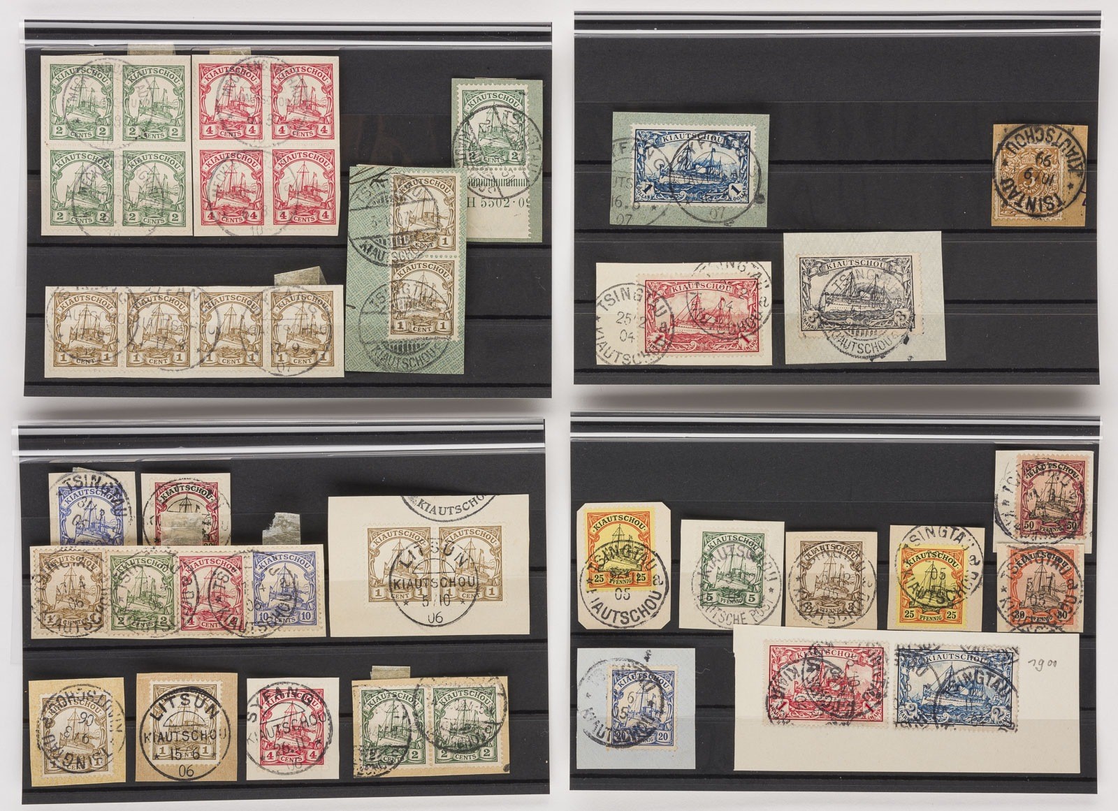 Kiautschou Konvolut 41 diverse Marken Kaiseryachtreihe, alle Marken auf Briefausschnitt, diverse