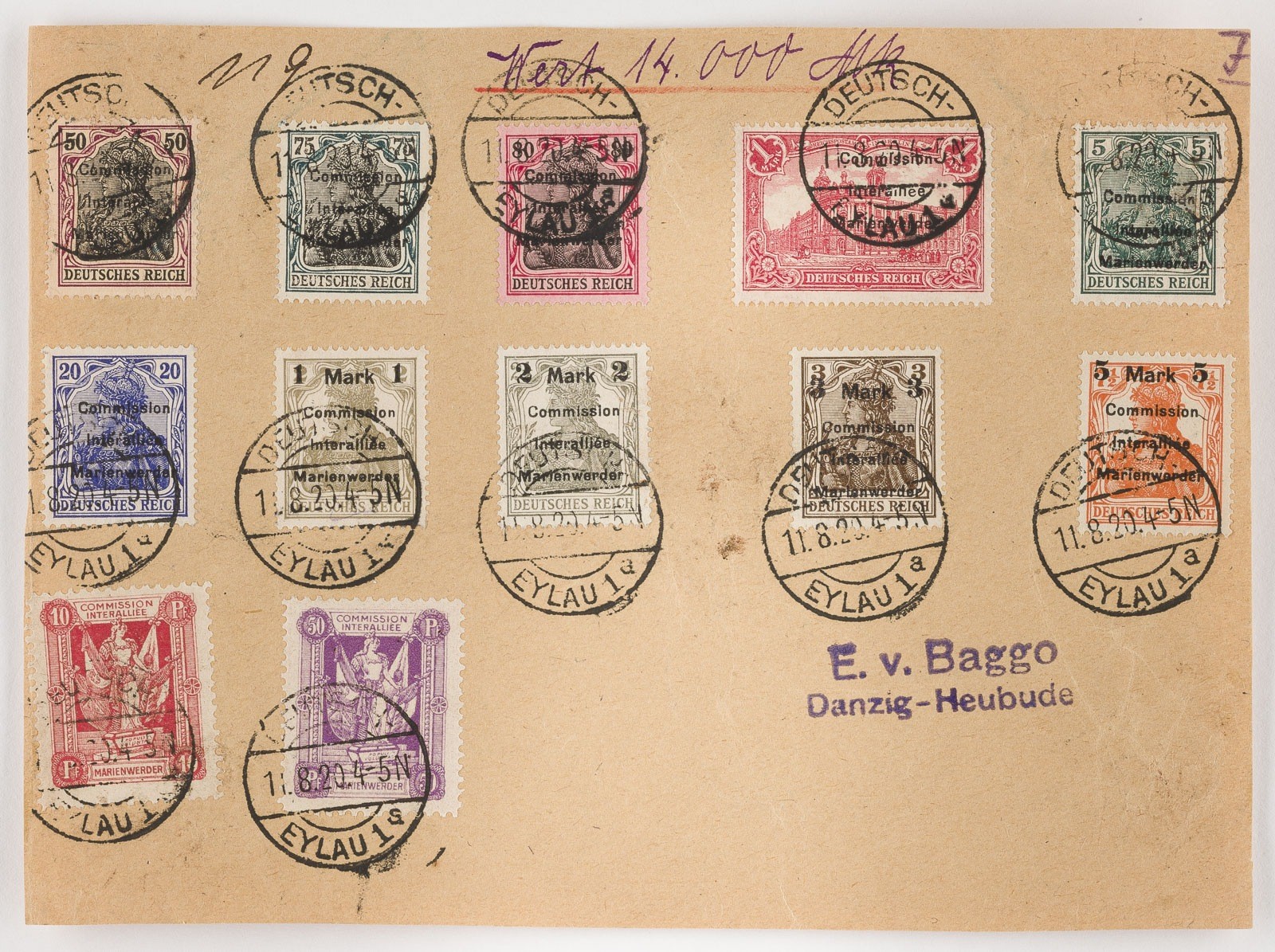 Marienwerder Wertbrief mit 5 Pfennig Marke und mittig doppeltem Aufdruck 'Interalliée'. Deutsches Reich, Inflationszeit 1920. Schwerfrankierter Geschäftsbrief mit Mischfrankatur aus Freimarken und Aufdruckmarken "Commission", Hochwertstufen bis 5 Mark, mehrfach entwertet mit Rundstempel "DEUTSCH-EYLAU 1a", 11.8.1920. Handschriftlicher Portovermerk "14.000 Mk". Adressiert nach Danzig-Heubude (E. v. Baggo). Zeittypisches Hochinflationsdokument mit außergewöhnlicher Frankaturdichte.