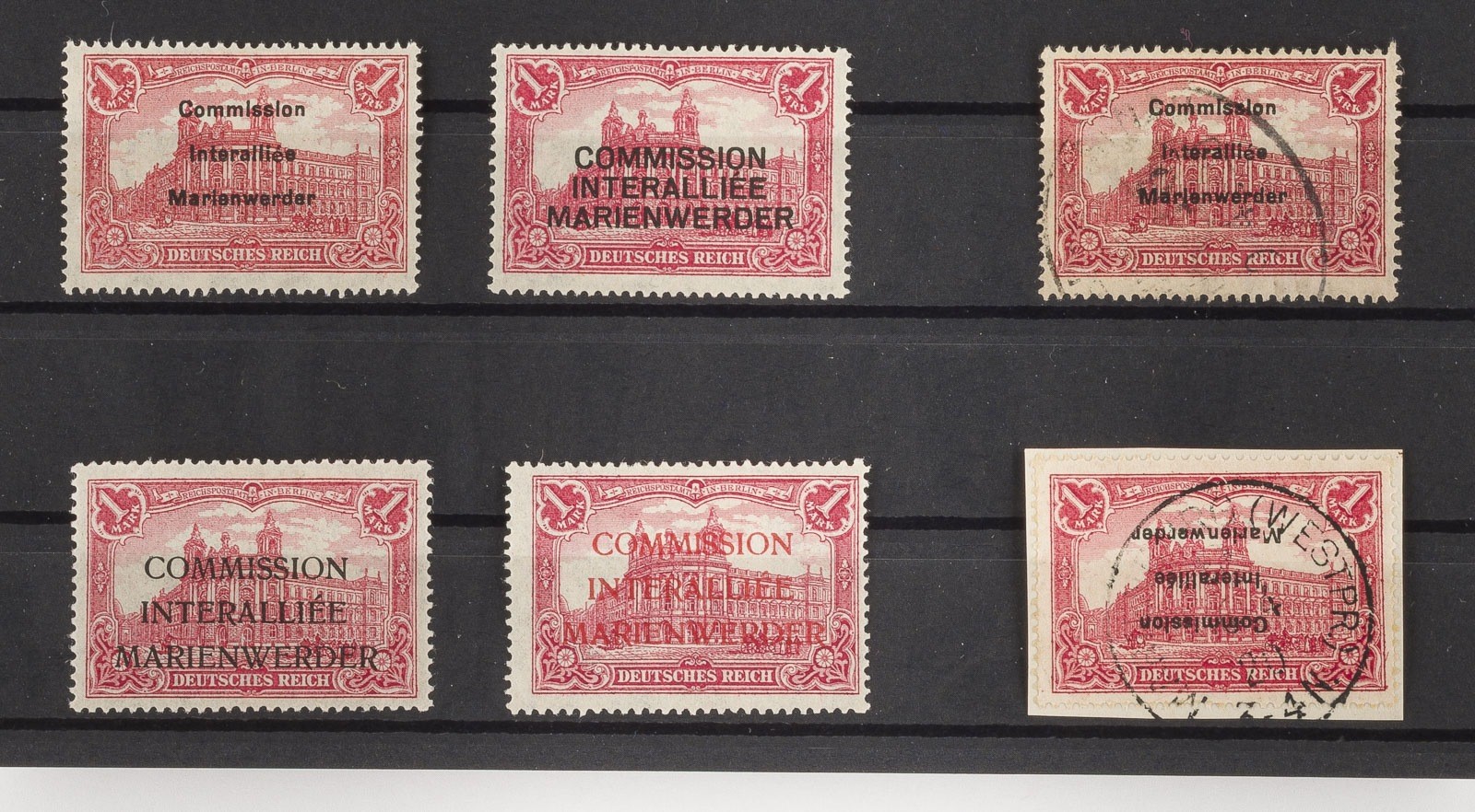Marienwerder Konvolut 6 Marken 'Repräsentative Darstellungen', zweimal 1 Mark mit schwarzem Aufdruck