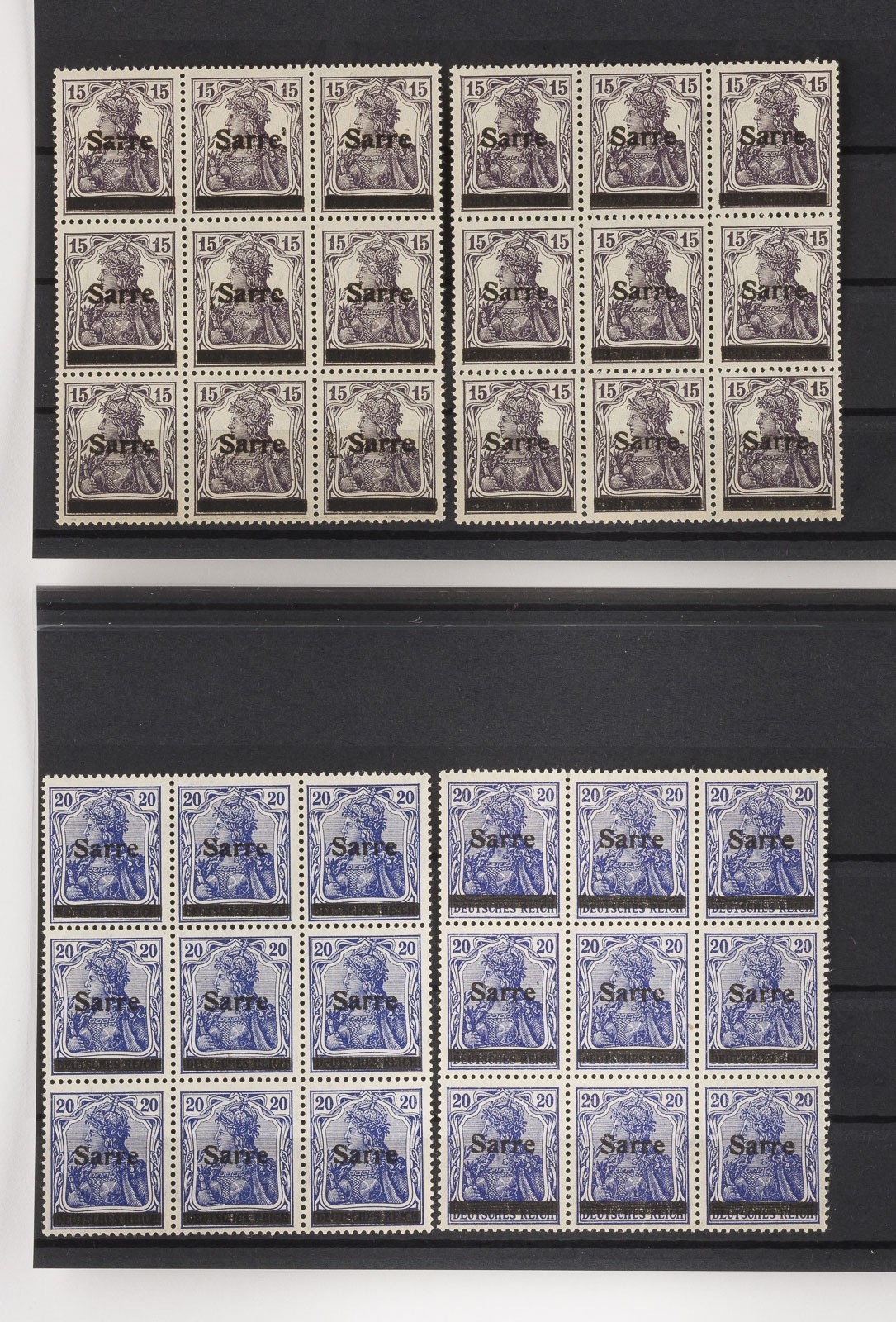 Saargebiet Konvolut 63 Marken der Germania-Reihe mit schwarzem Aufdruck Sarre und schwarzem Balken.