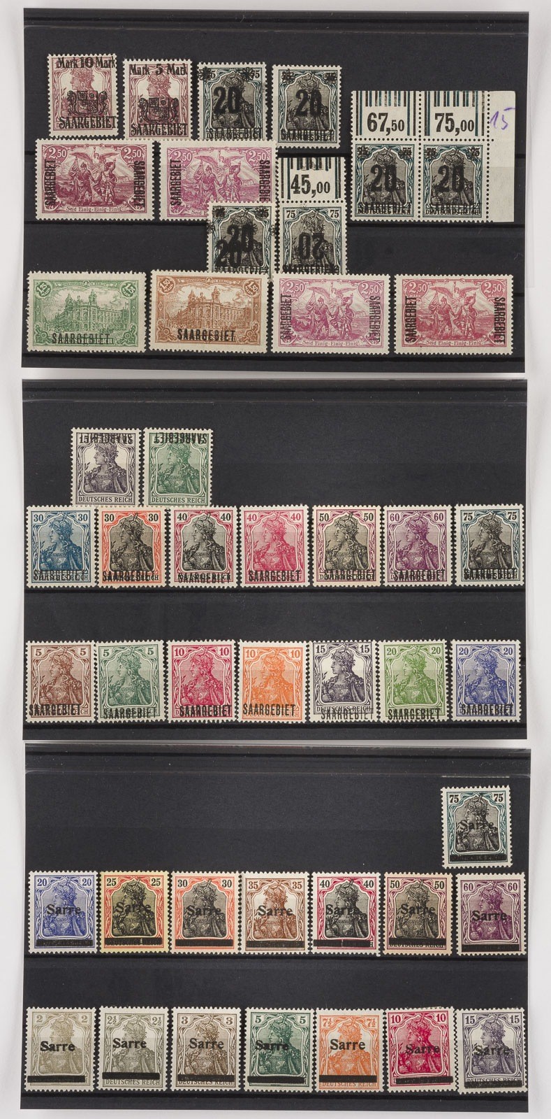 Saargebiet Konvolut 66 diverse Marken aus der Germania-Reihe, partiell schwarzer Aufdruck 'Sarre'
