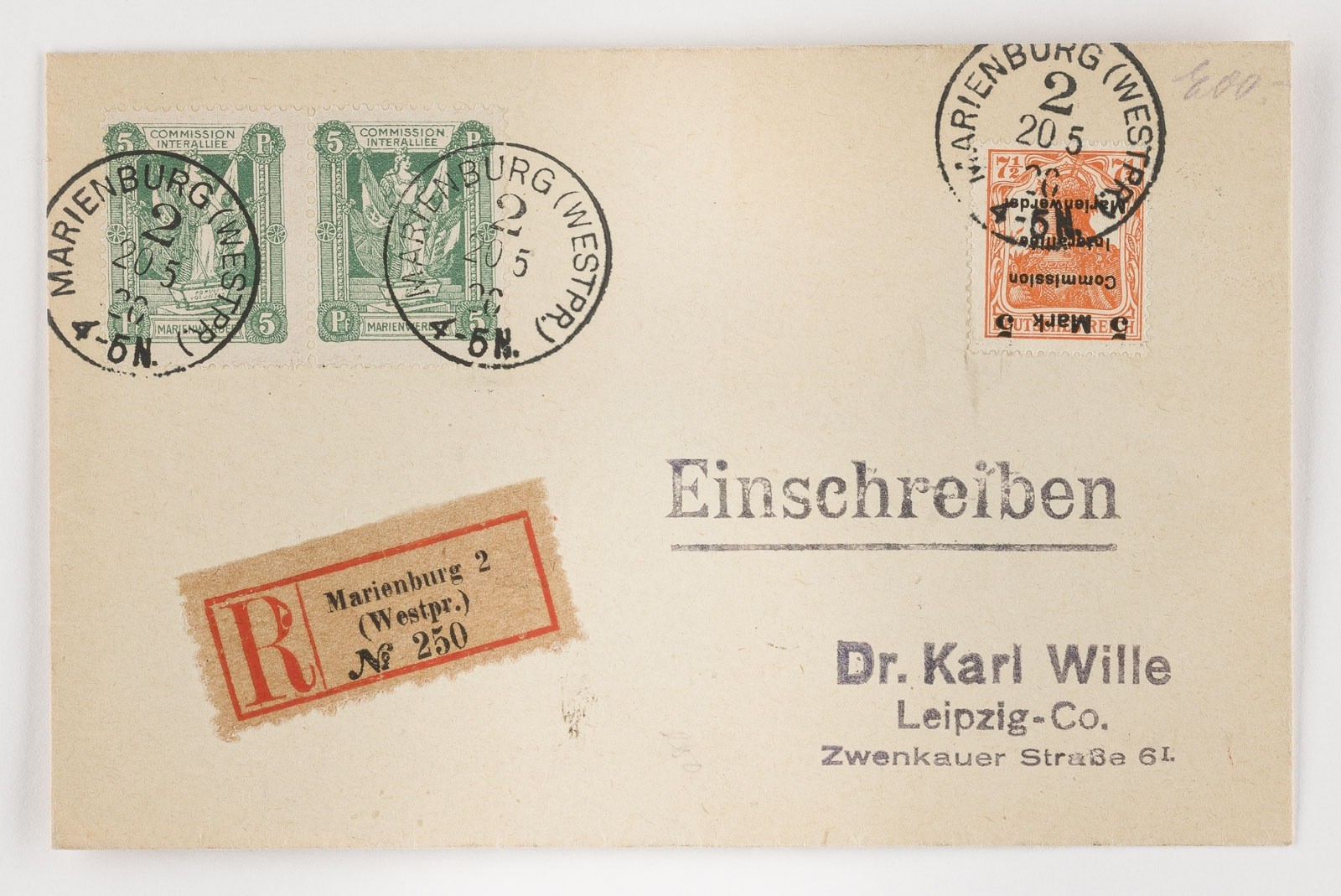 Marienwerder Einschreibebrief nach Leipzig, frankiert mit zweimal 2 Pfennig Marke Abstimmungssymbol,