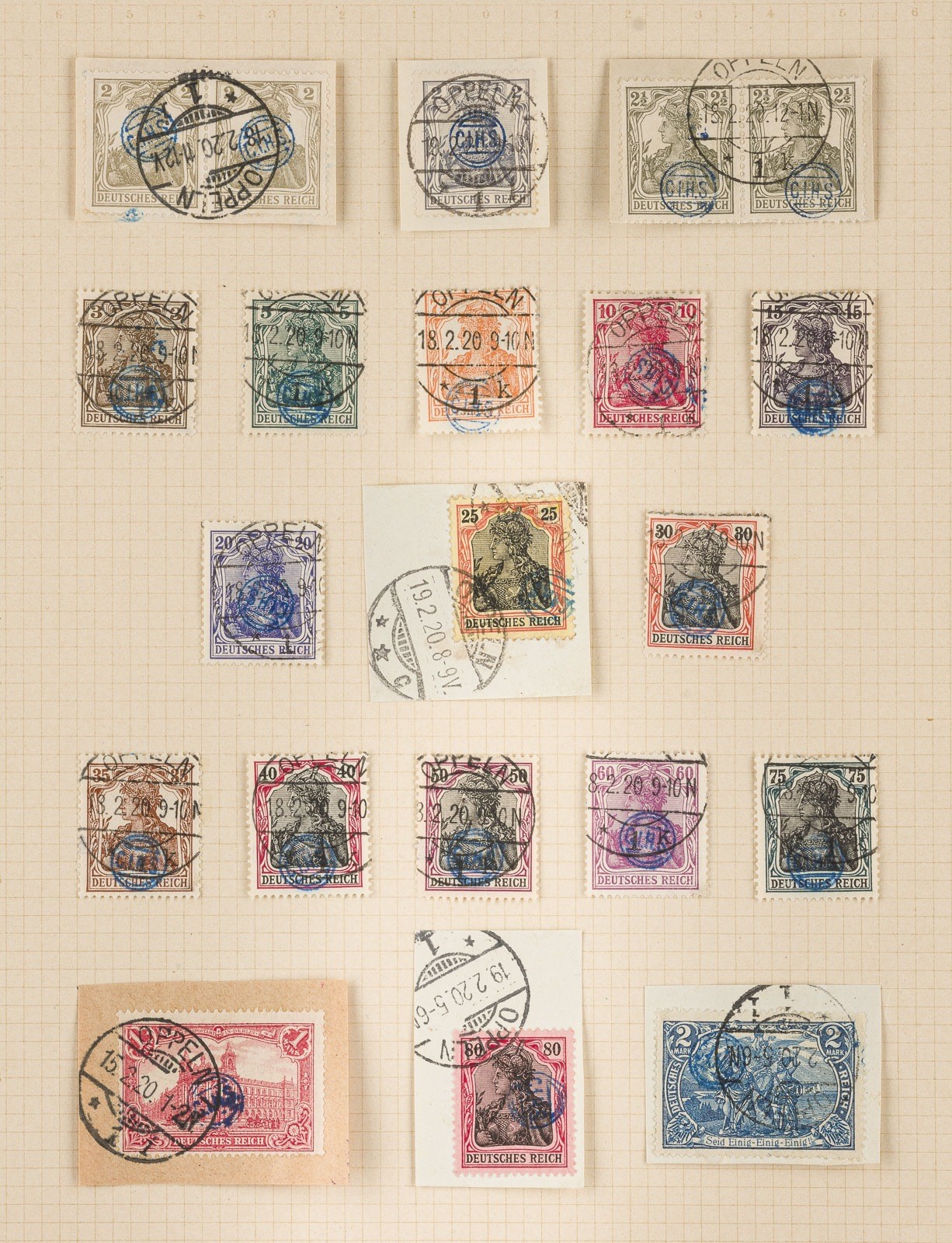 Oberschlesien Oppelner Notausgabe Satz von 21 Marken Oppelner Notausgabe: Deutsches Reich (Germania und Repäsentative Darstellungen), alle mit blauem Handstempelaufdruck 'C.I.H.S.' und Zweikreisrundstempel 'OPPELN 18.2.20 9-10 N' / 15.2.20 1-2 N / 19.2.20 5-6N', teilweise auf Briefausschnitt. Marken teilweise mit Prüfstempel Dr. Müller, Haertel und M.H.