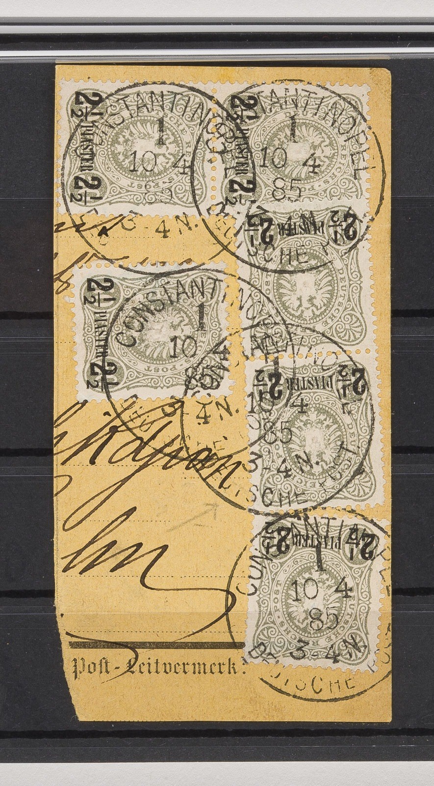 Türkei Deutsches Reich - Post-Zeitvermerk-Kartenausschnitt, Mehrfachfrankatur mit 6 Marken zu je 50 Pfennig, jeweils mit horizontalem schwarzem Aufdruck '2½ PIASTER'. Mehrfach klar abgeschlagene Kreisstempel, CONSTANTINOPEL 1 10 4 85 3-4N' überwiegend sauber und gut lesbar, teilweise übergreifend auf Formular und Marken.