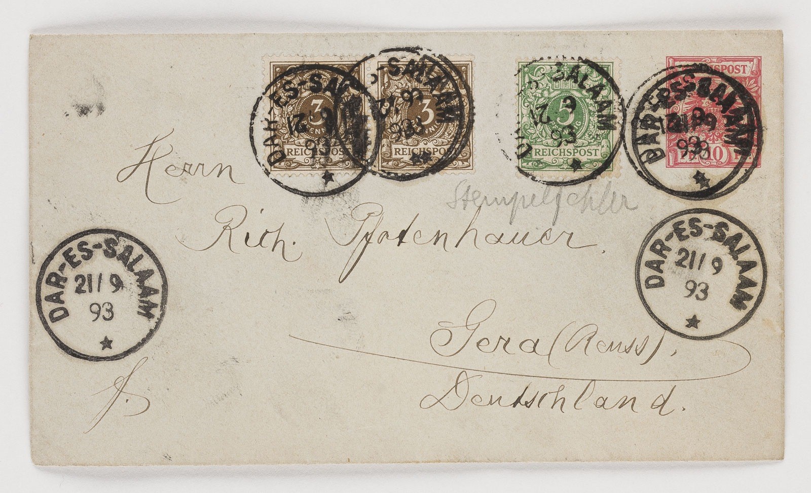 Vollständig erhaltener Auslandsbrief, aufgegeben Dar-es-Salaam, klarer Kreisstempel 'DAR-ES-SALAM * 21.9.93'.nFrankatur bestehend aus Deutsches Reich, Reichspost-Ausgabe (Krone/Adler) (Vorläufer): 2 × 3 Pf braun, 1 × 5 Pf grün, 1 × 10 Pf karmin.