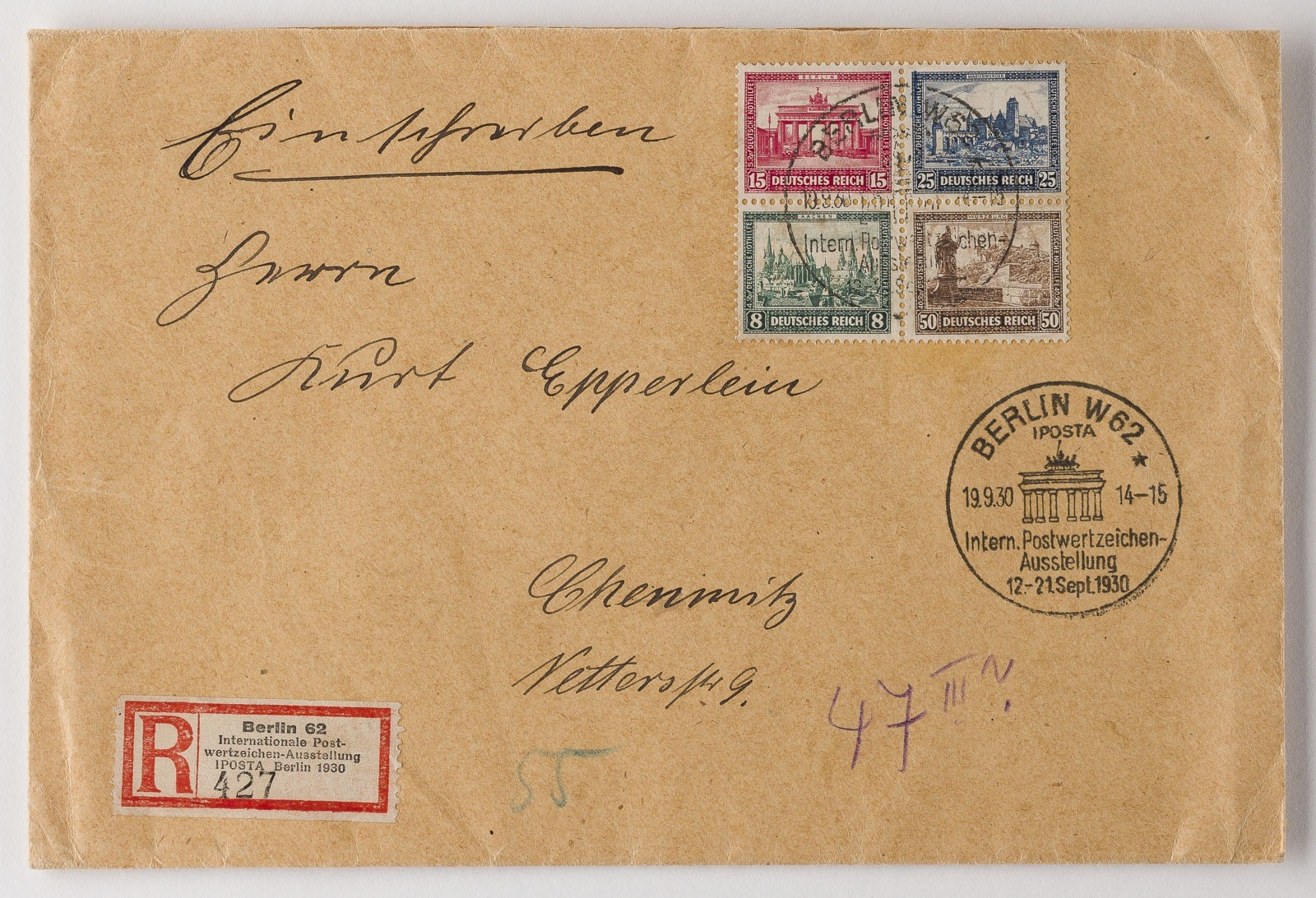 Deutsche Reichspost Inlandsbrief Einschreiben 'Internationale Postwertzeichen-Austellung' nach Chemnitz: Ohne