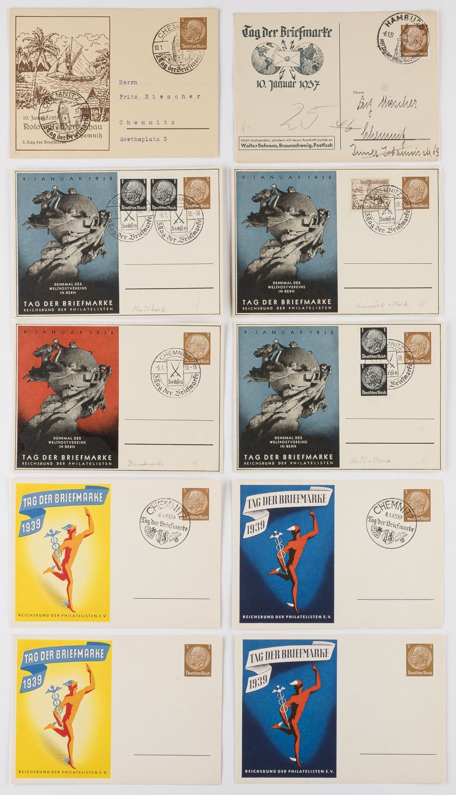 Deutsche Reichspost Konvolut 10 diverse Postkarten (Drucksache) zum Tag der Briefmarke 1937 bis 1939.