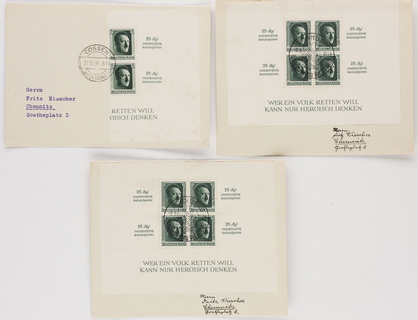 Deutsche Reichspost Konvolut drei Viererblocks der 6 Pfennig Adolf-Hitler-Marke auf adressierten und