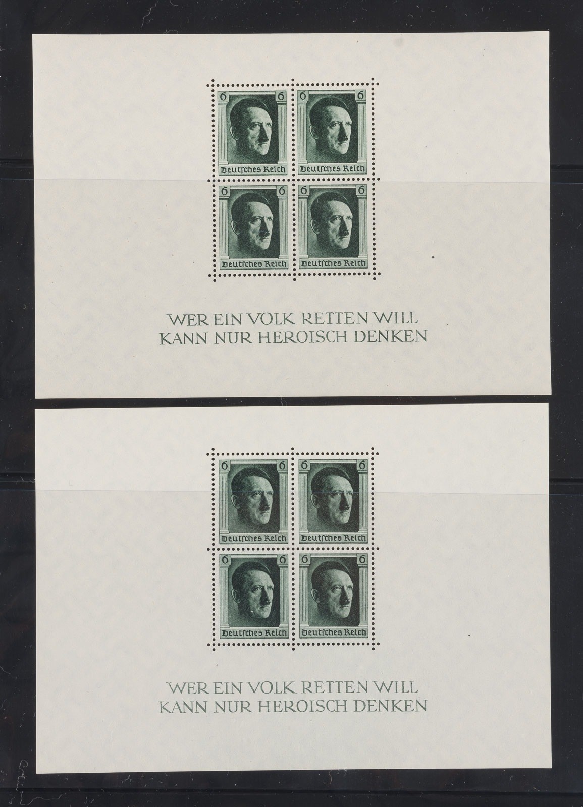 Deutsche Reichspost Konvolut 7 Blöcke Nr. 7, 1937, 48. Geburtstag von Adolf Hitler, davon einer mit zweifachem