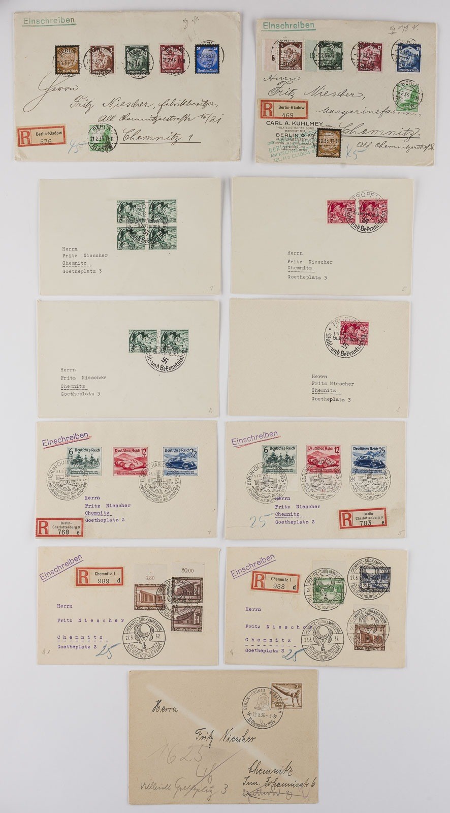 Deutsche Reichspost Konvolut 8 Einschreibe-Briefe mit Mehrfachfrankaturen und 5 Inlandsbriefe nach Chemnitz: