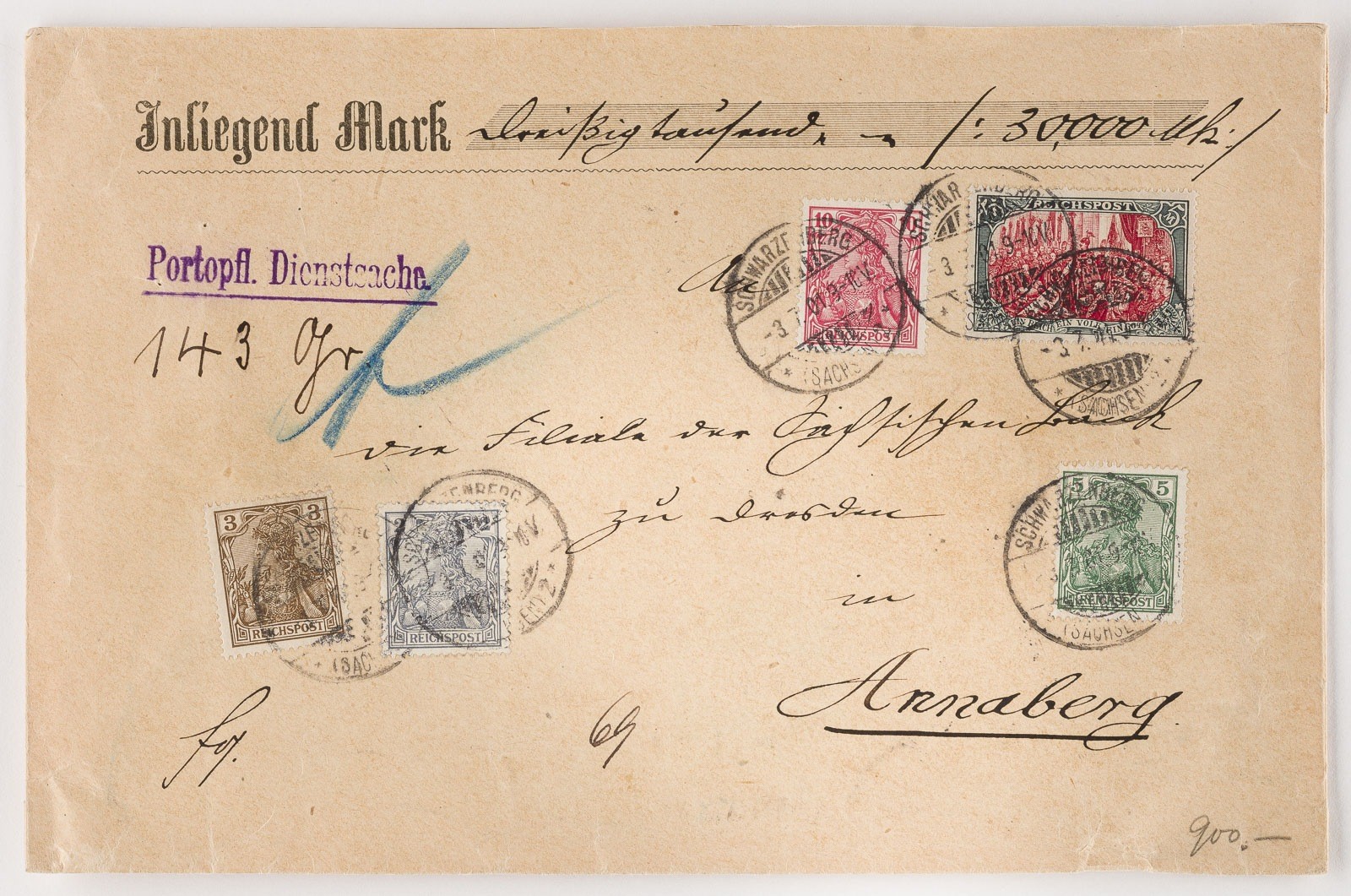 Deutsche Reichspost Inlandbrief / Inlandswertbrief 30.000.- MK nach Annaberg: Germania 2 Pfennig, 3 Pfennig, 5