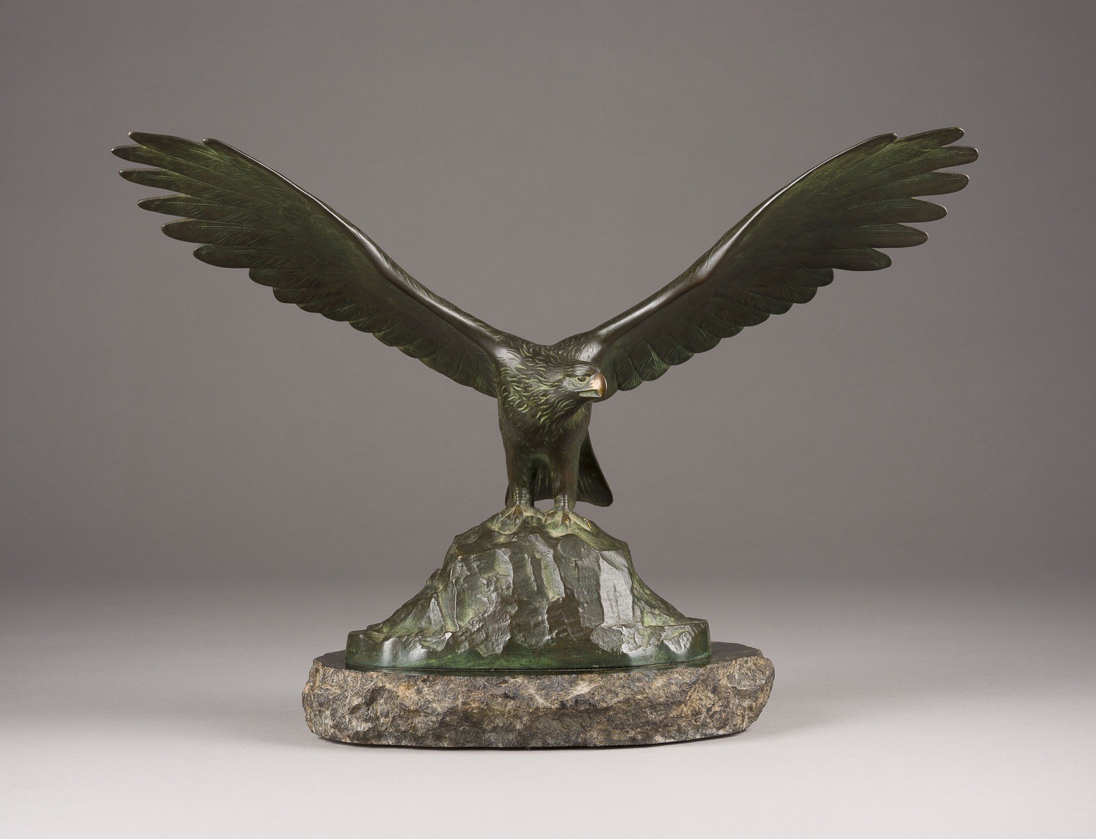 Bronze, dunkel patiniert, auf einem Steinsockel (H. 4 cm). Ges.- H. 33,5, B. 45, T. 25 cm, Gew. ca. 7,2 kg. Auf der Plinthe bezeichnet 'Prof. Poertzel'. Über einem ovalförmigen Stand felsartige Plinthe mit der vollplastischen Darstellung eines Adlers mit ausgebreiteten Flügeln.
