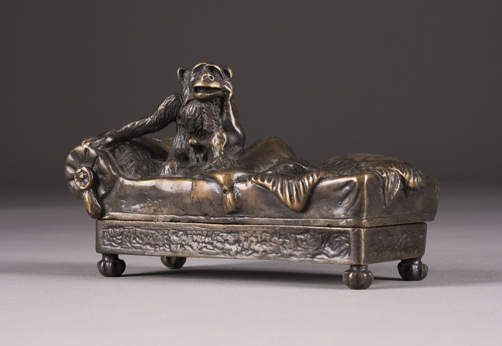 Wiener Bronze, dunkel patiniert,. H. 7,5, B. 14, T. 6,5 cm, Gew. ca. 0,59kg. Rückseitig Krugmarke 'B', Verso innen bez. 'B17?'. Wiener Erotikbronze mit humorvoller, doppelbödiger Darstellung eines erigierten Affen, der