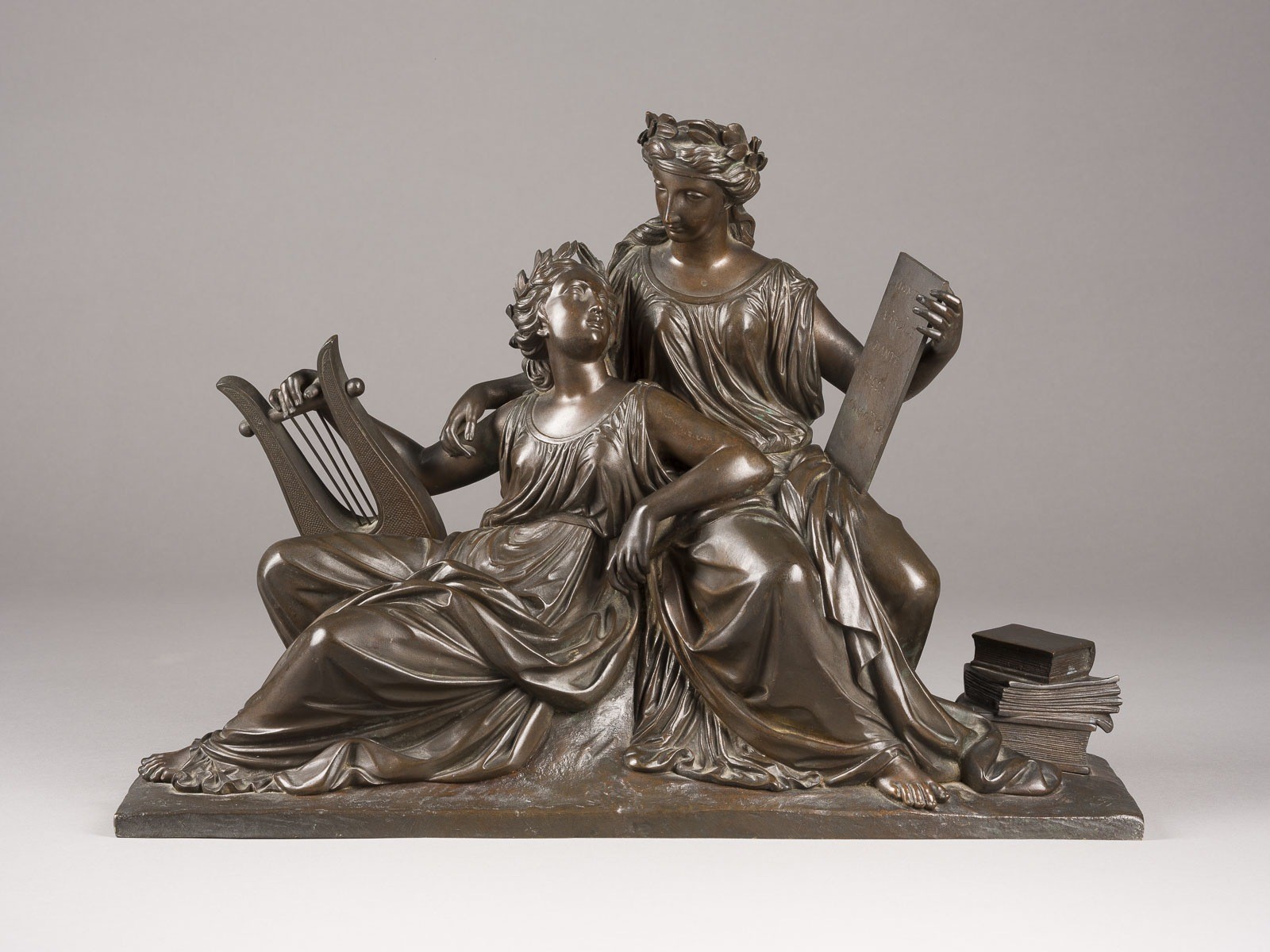 Bronze, dunkel patiniert, auf naturalistischer Plinthe (H. 2 cm). Ges.-H. 30, B. 42, T. 15 cm, Gew. ca. 10,11kg. Allegorische Darstellung der Poesie und der Apotheose der Dichter. Die weiblichen