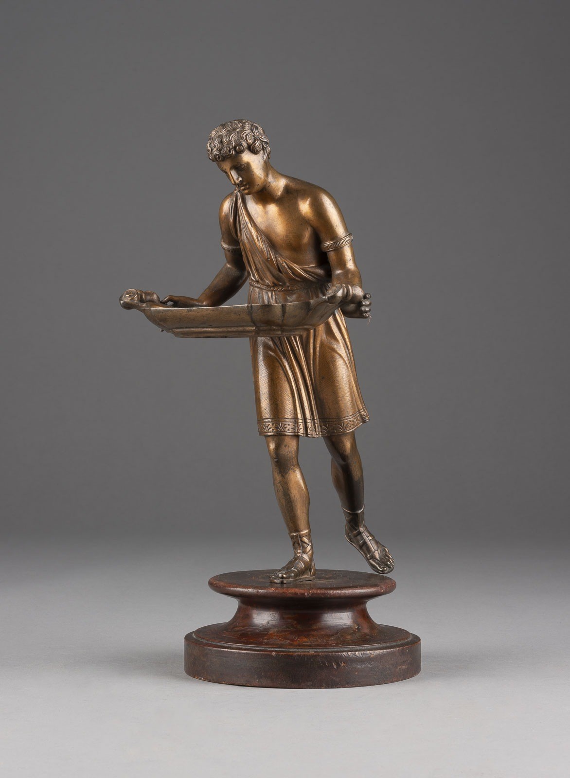 Bronze, braun patiniert, auf rundem Sockel (H. 6 cm). Ges. H. 36, B. 18, T. 17 cm, Gew. ca. 3 kg. Part. ber. und Verlust der Patina.