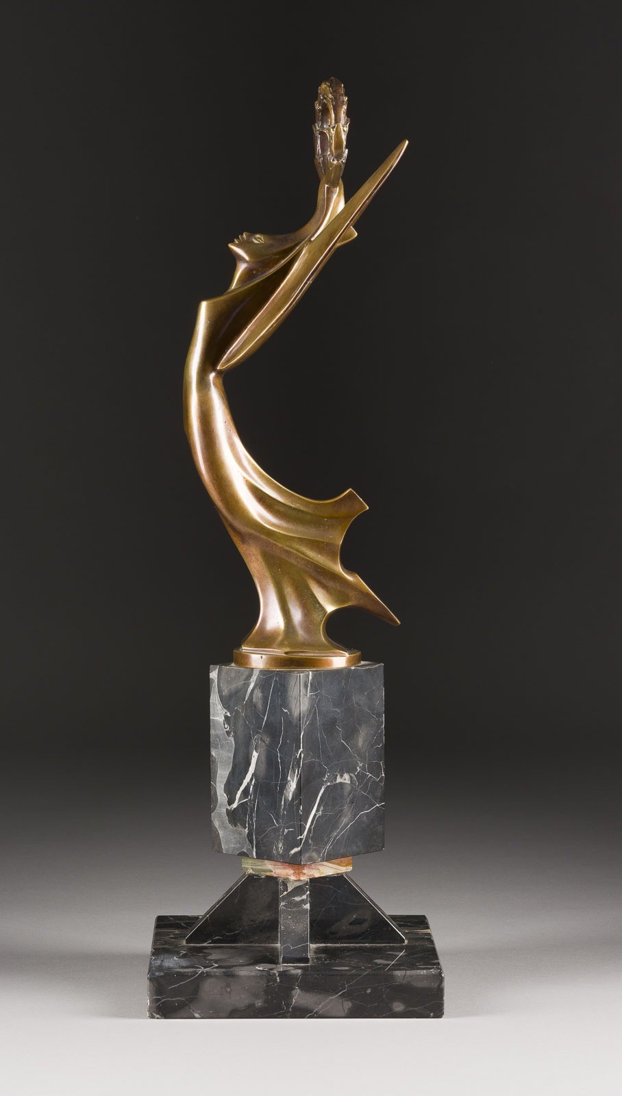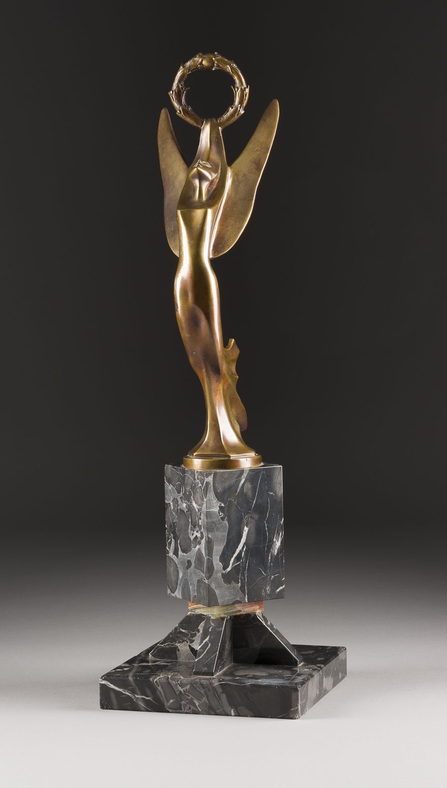 Bronze, golden patiniert, auf ovaler Plinthe und Podestmarmorsockel (H. 22 cm). Ges.-H. 58, B. 18, T. 19 cm, Gew. ca. 8,6kg. Unsigniert, vermutlich französischer Bildplastiker. Stilisierte Art-Déco-Bronze mit der Darstellung einer Allegorie des Sieges. Die