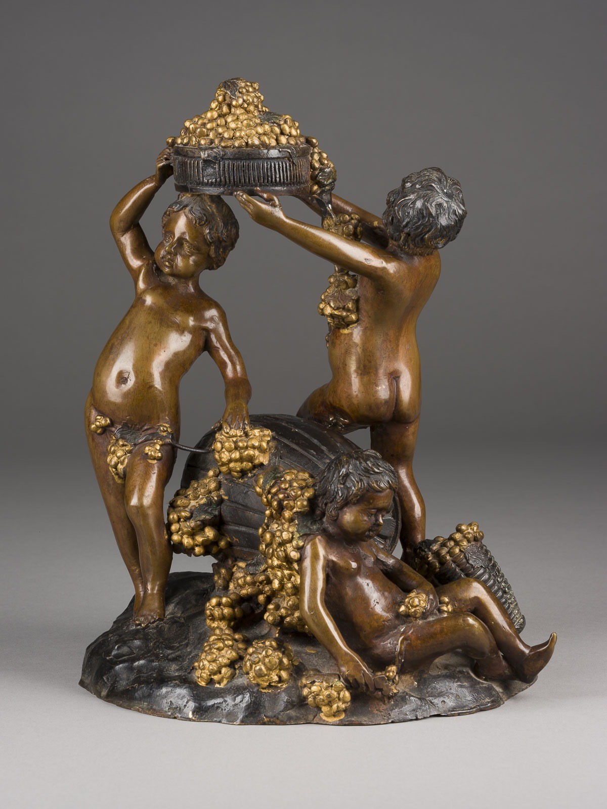 Bronze, vergoldet, braun und dunkel patiniert. H. 30,5, B. 25, T. 25 cm, Gew. ca. 6,85kg. Part. best. und Verlust der Patina.