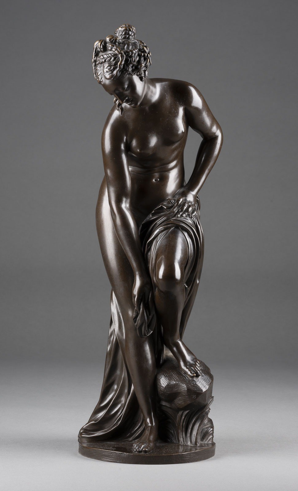 Bronze, braun patiniert, auf runder Plinthe (H. 1,5 cm). Ges.-H. 48,5, D. 16 cm, Gew. ca. 9,62 kg. am Felsen gestempelte Krone.