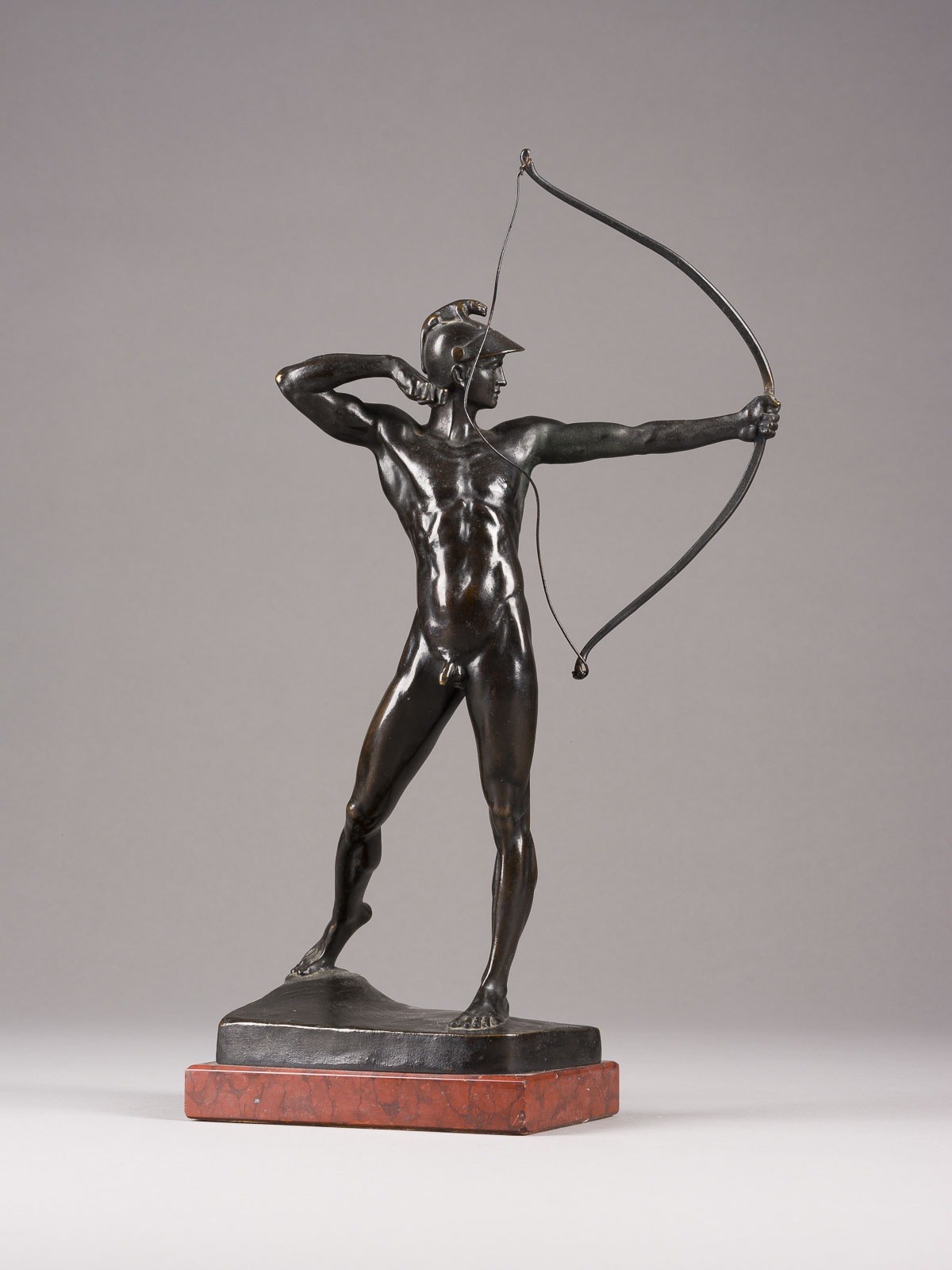 Bronze, dunkel patiniert, auf Plinthe und Marmorsockel (H. 2,5 cm). Ges.-H. 38, B. 22, T. 10 cm, Gew. ca. 2,76 kg. Auf der Plinthe bez. 'E. M. Geyger fec.' und seitlich Giessereimarke 'Akt. Ges. v. H. Gladenbeck & Sohn'.